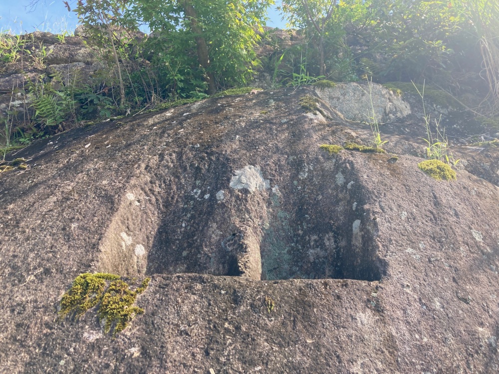 天守台へ向かう道は、くねくねとつづら折りになっていて、巨大な岩山のへりを右へ左へ曲がりながら登っていきます。綿倉門(わたくらもん)を超えると道が180度折れ曲がる急カーブがあり、本丸への第二の関門、坂下門(さかしたもん)へ。今でも門の礎石と手前の石段がしっかり残っているのがすごい!そしてその先には、菱櫓門跡(ひしやぐらもんあと)があり、横の巨石には門の柱を乗せるための大きな穴が残されていました。