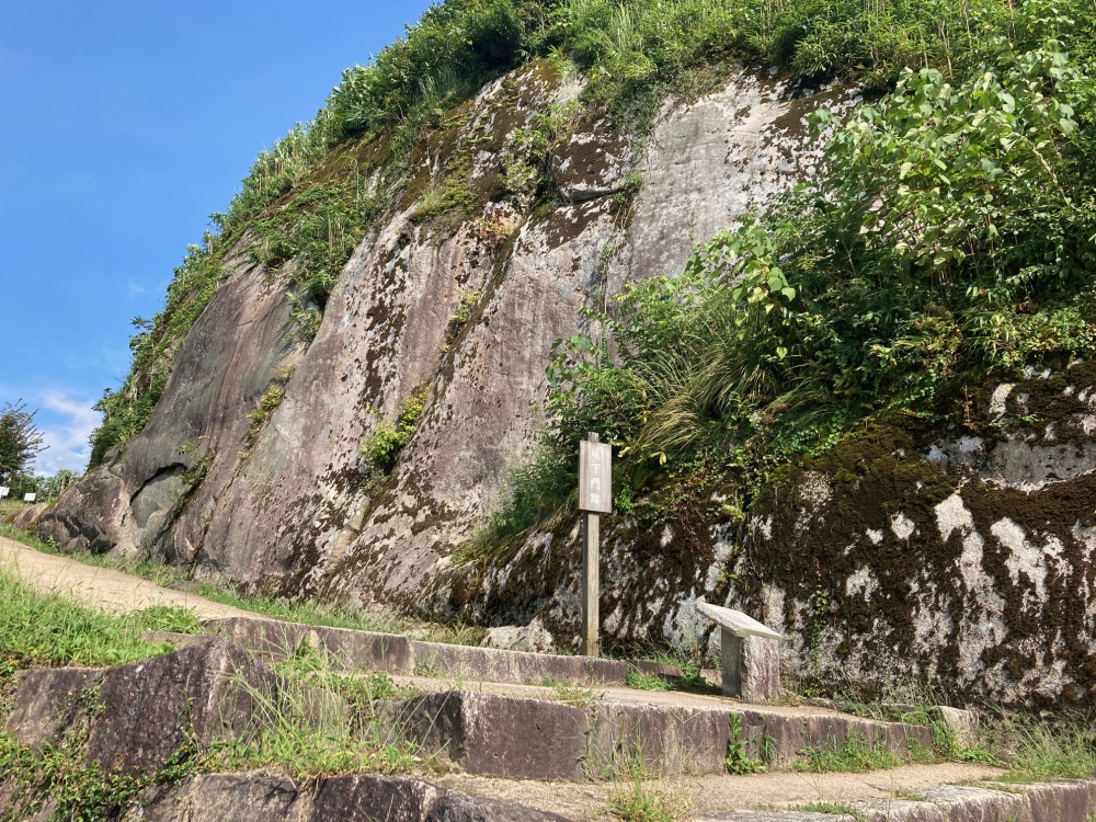 - この岩は、周囲45mほどの自然石です。かつて、苗木城が敵に攻められ水を断たれた際に、この岩の上に馬を乗せて米で洗うことで「水が豊富である」と思い込ませたエピソードが由来となっています。