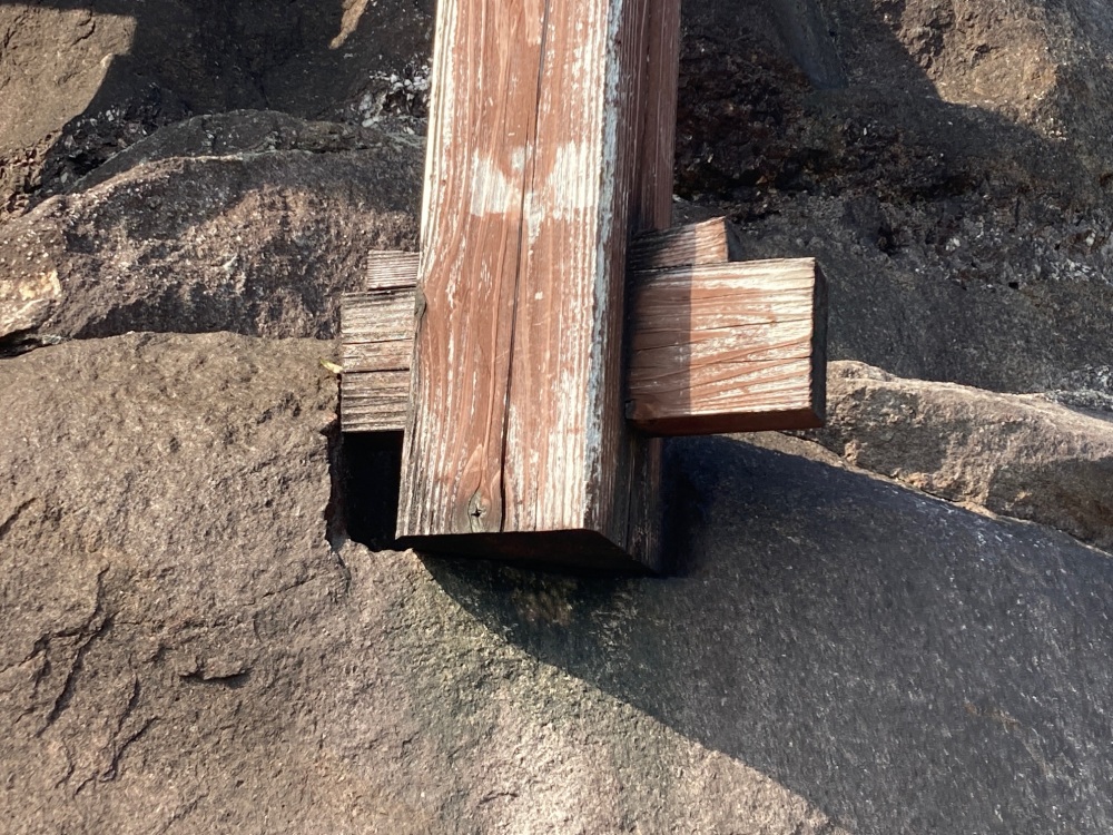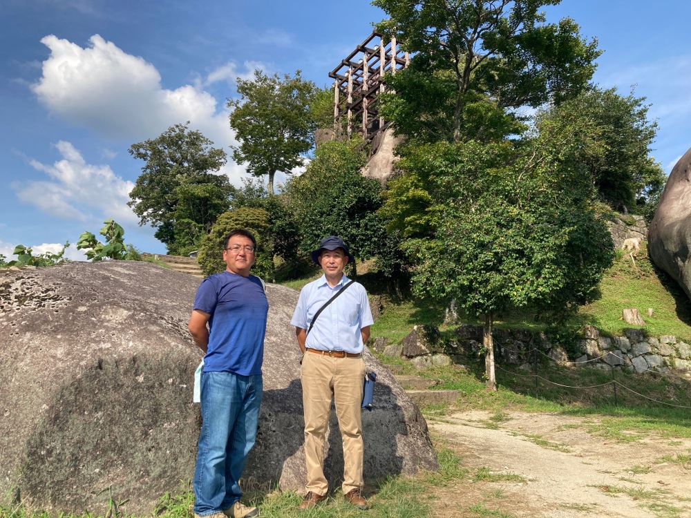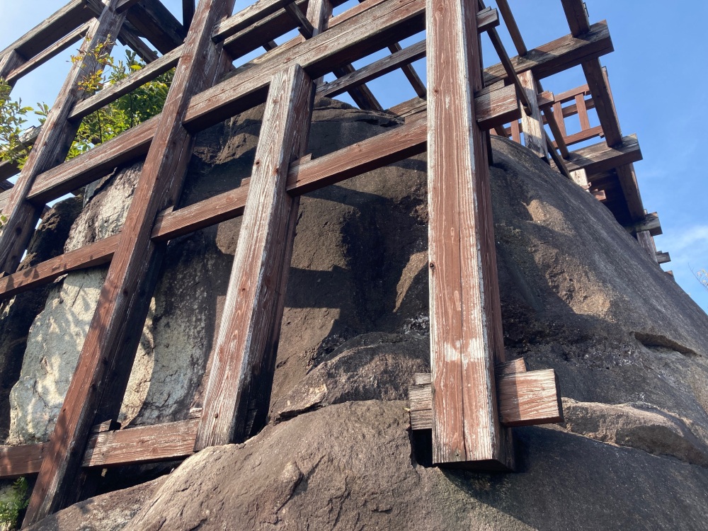 いよいよ「天守」に到着。かつて三層の天守が建てられていた山頂には、柱があった穴を再利用して組まれた展望台があります。