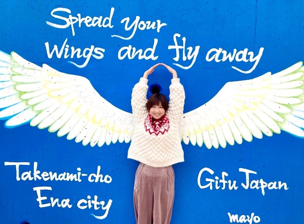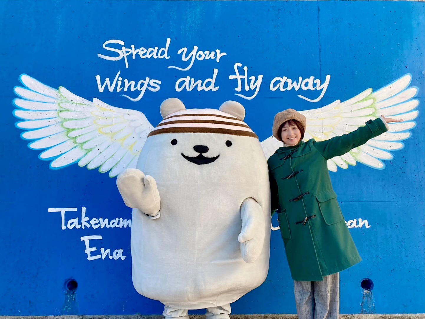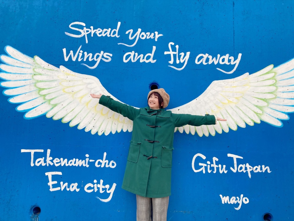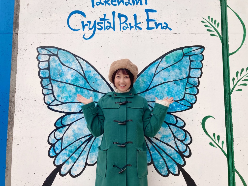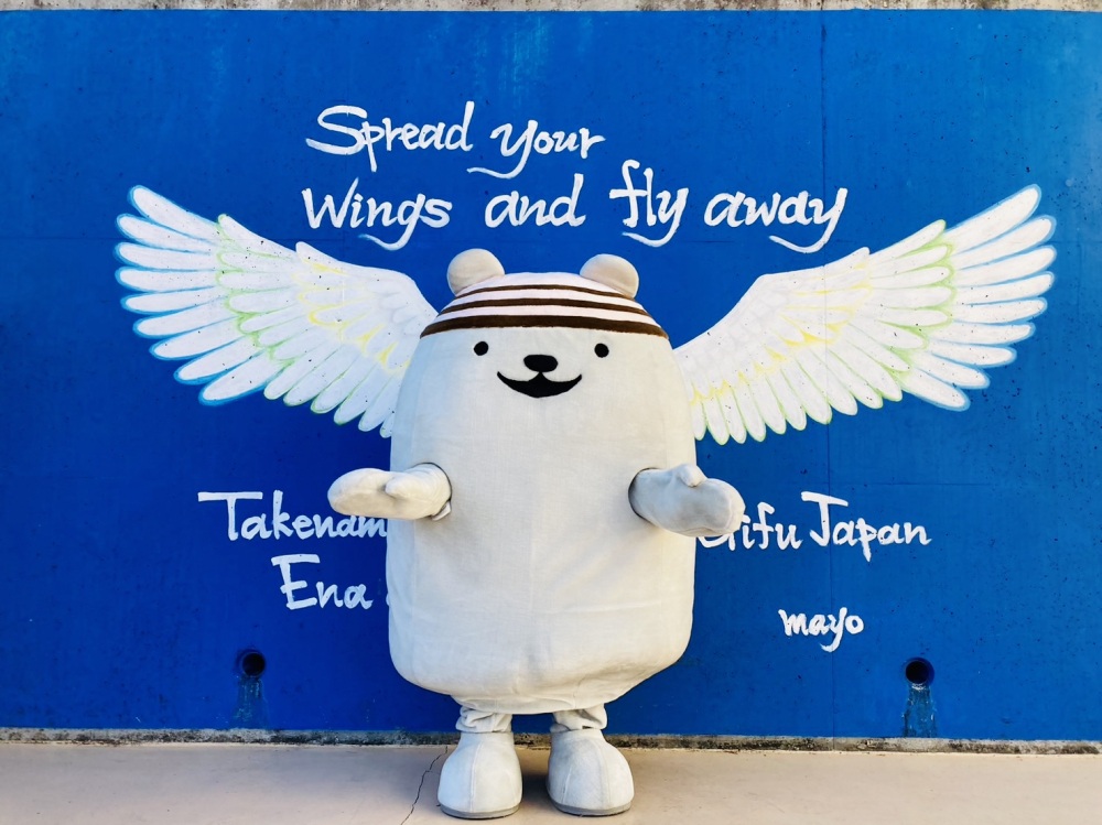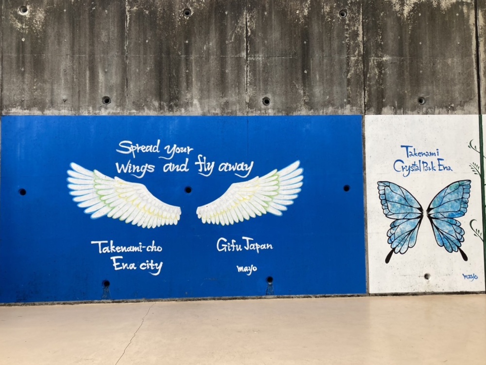 特に人気なのが、「天使の羽」のウォールアート。クリスタルパーク恵那スケート場のキャラクター「クリス」が立つとこんな感じです。超かわいいですよね〜、私も天使になってみました。お隣のアゲハチョウのウォールアートも、前に立つだけで「盛れる」写真が撮れるので、ポーズや表情を変えてパチリ。楽しかった〜。