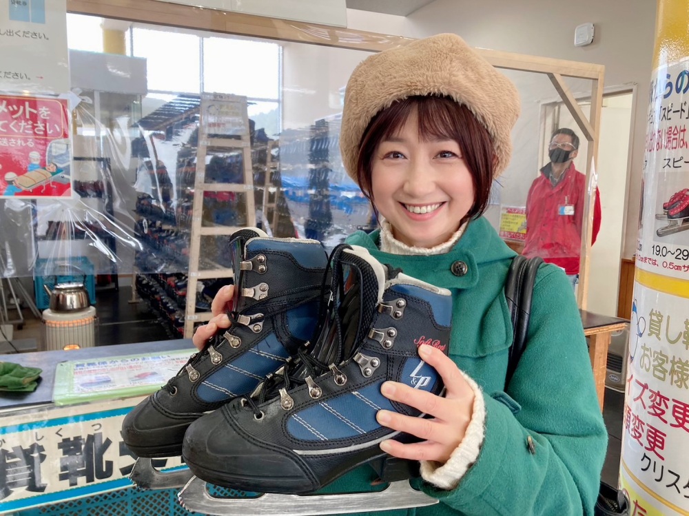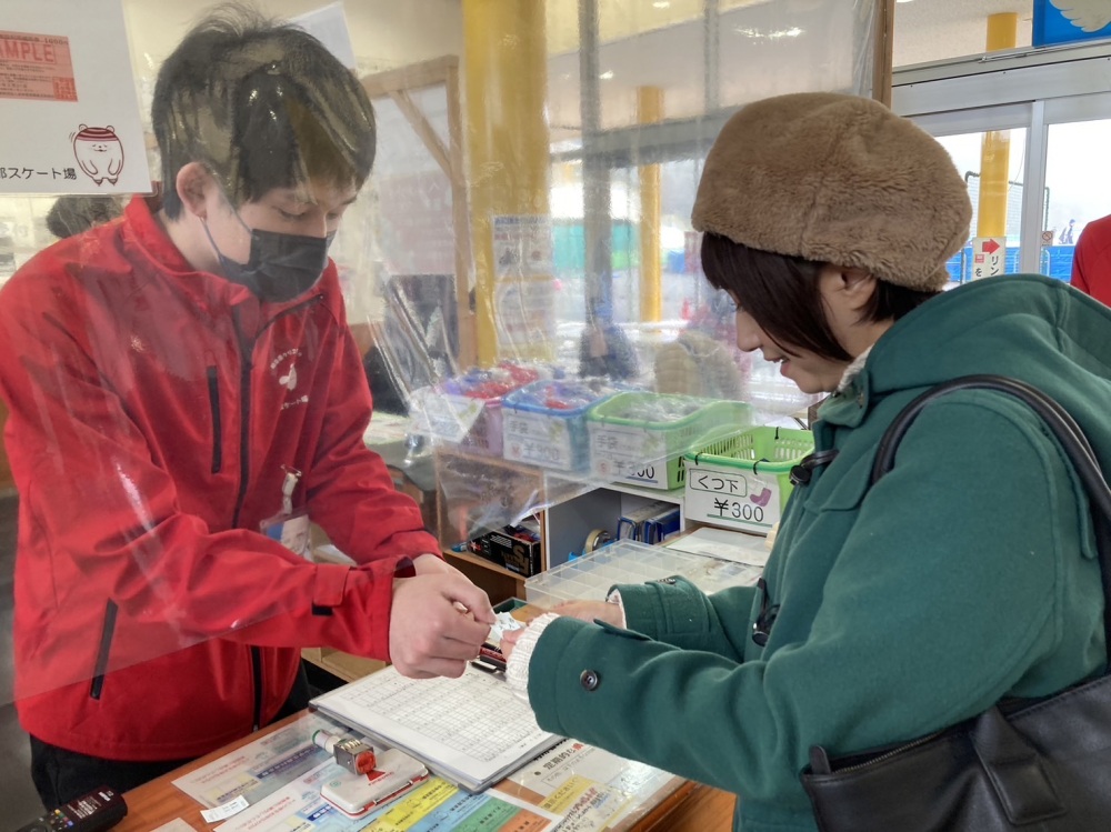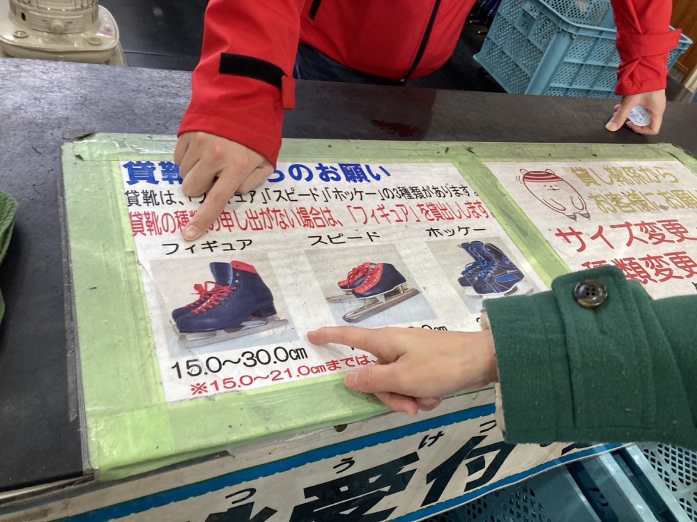 せっかくスケート場に来たので、私もスケートに挑戦。スケートは小学校以来なので、ドキドキ緊張しながら「1日滑走券」を購入しました。貸靴は「フィギュア」「スピード」「ホッケー」の3種類から選べますが、フィギュア用のスケート靴は、ブレード(刃の部分)が分厚く、氷の上でもバランスが取りやすく安定性があるとのことで、初心者の私は「フィギュア」をチョイス。またサイズは、履いてみて痛くないけど、つま先が動かないくらいがジャストサイズだそうですよ〜。