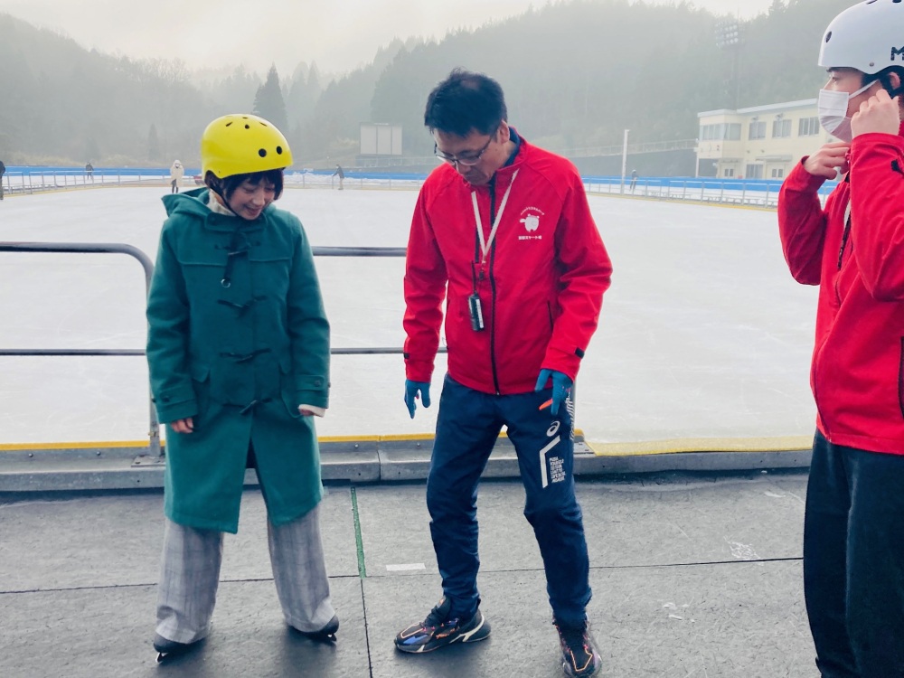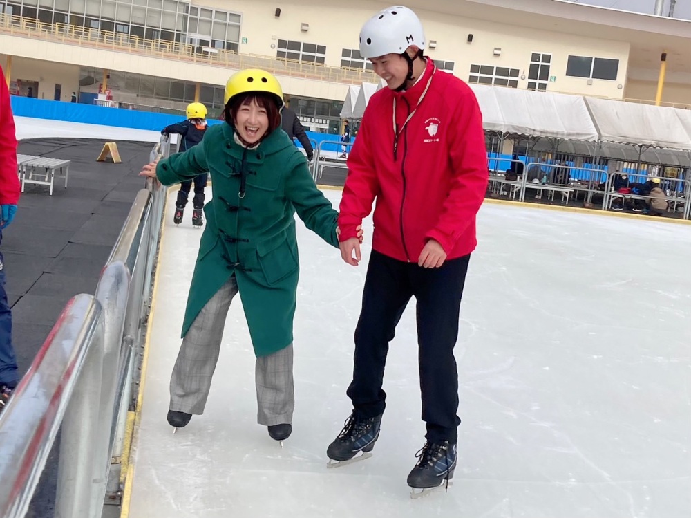 ということで、いざ、リンクへ。一歩足を踏み入れた瞬間、スケート場にこだまする私の悲鳴(笑)滑ることはおろか、歩くことすらままならない、まるで生まれたての子鹿のような足取りでしたが、地元恵那で子供の頃からスケートに慣れ親しんでいたという水野さんの助けも借りて、少しづつ滑れるようになってくると、怖いが楽しいに変わるから不思議ですね〜。目標であったリンクの中央までたどり着けたときは達成感でいっぱいでした。チャレンジして本当に良かったです。