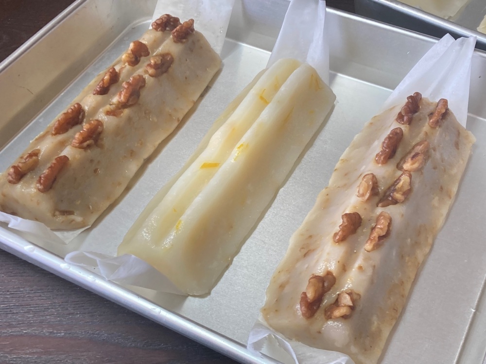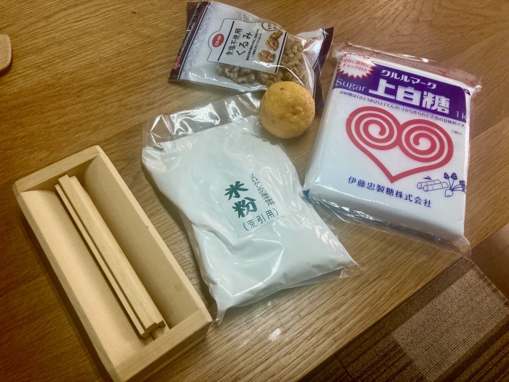 6本分の「からすみ」を作るのに用意する材料は、米粉500g、砂糖400g、水600cc、塩小さじ1/2 に、具材にする「くるみ」と「柚子」のみ。