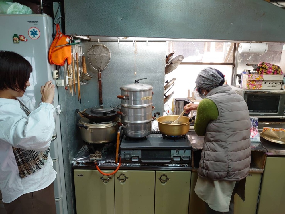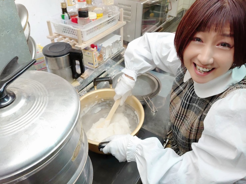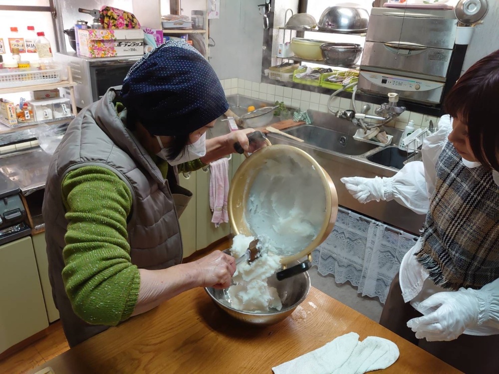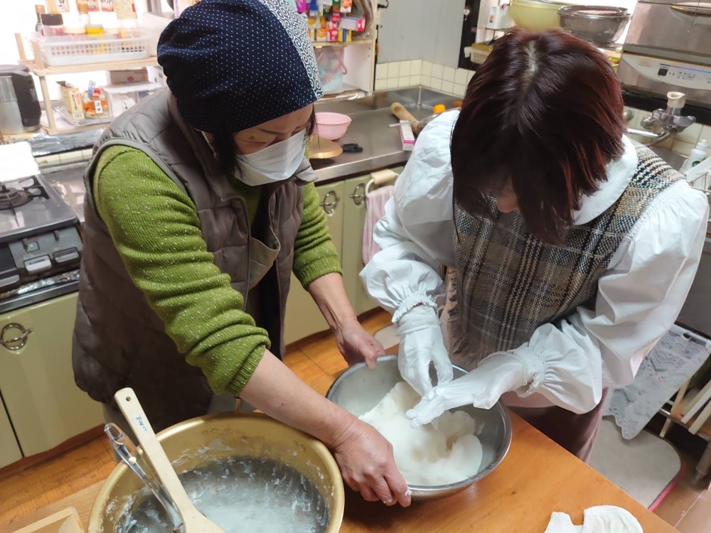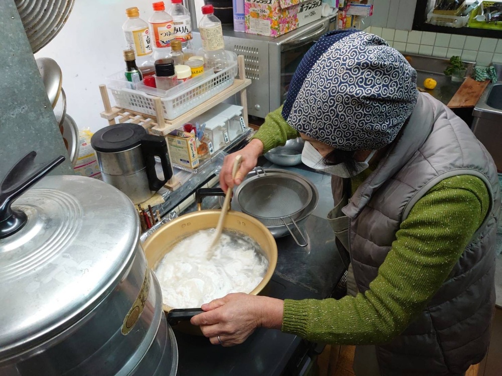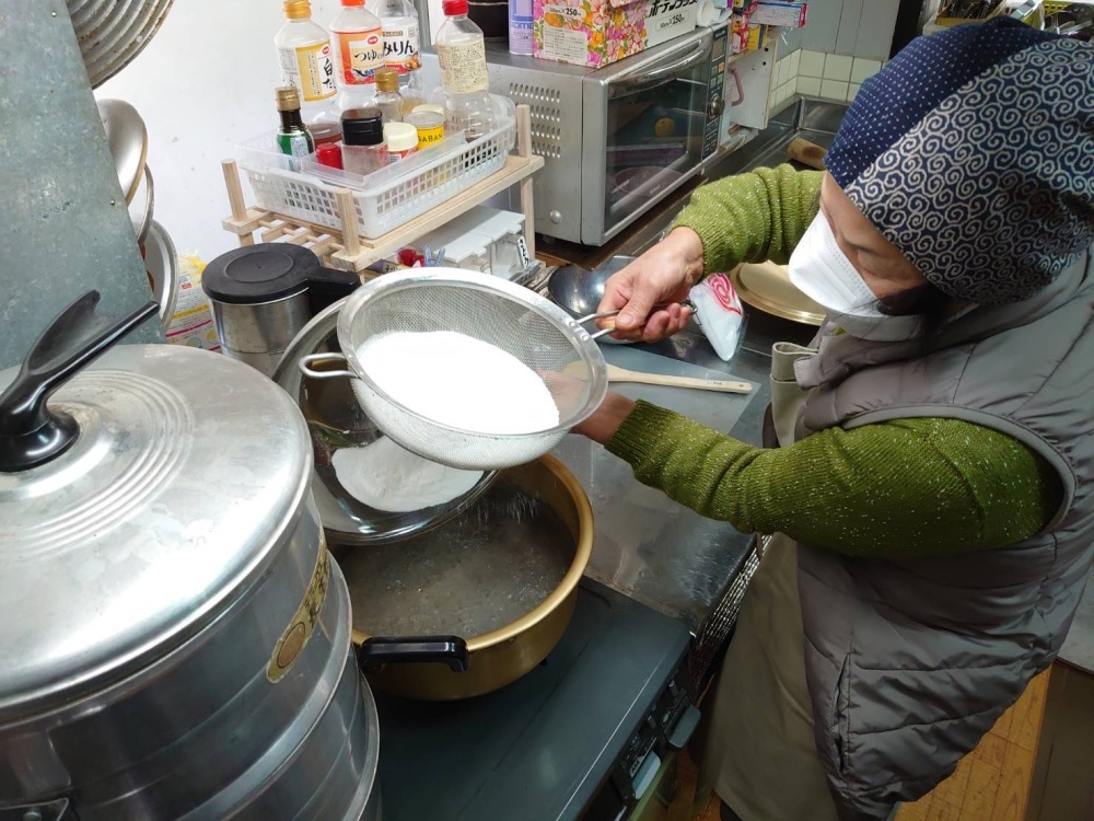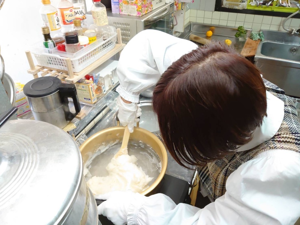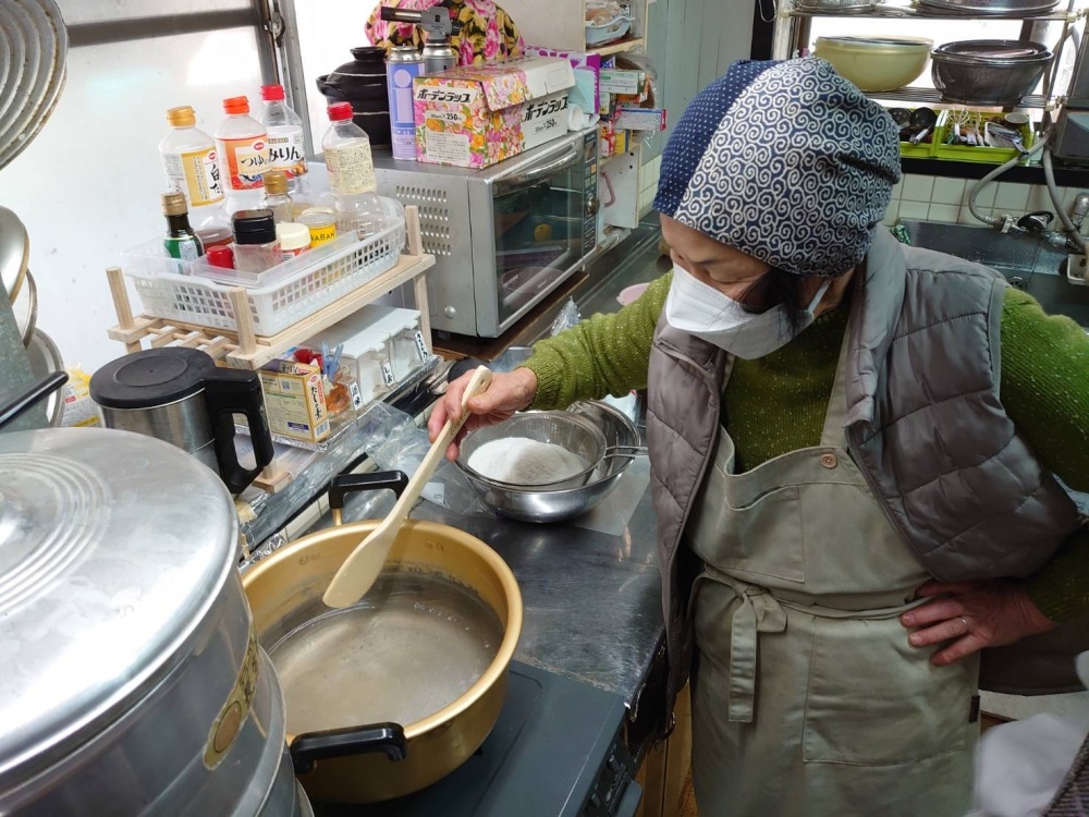 鍋が沸騰してきたら米粉を入れてザックリ混ぜ、ぐつぐつ沸騰し水分がなくなりだしたら、今度は火を弱くしてよく練るのですが、これにはとても力がいります。亀井さんが手際よくやっているのを見て私もできそうだと思いましたが、実際やってみたら、全然、練ることができず、自分の無力さに打ちのめされました。が、時間との勝負。全身の力を振り絞って練り、焦げそうになったら火を止めて、さらに練るという工程を無心になってやっていたら、日頃の考え事や雑念が吹き飛んでいました。