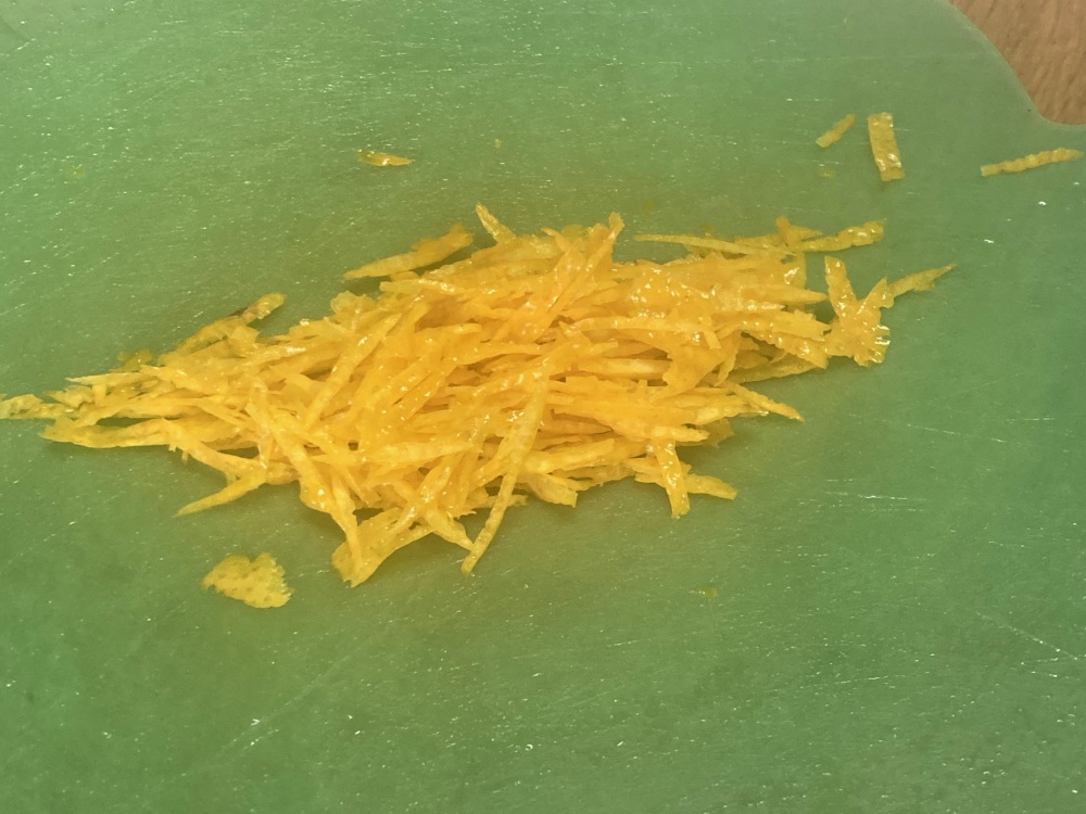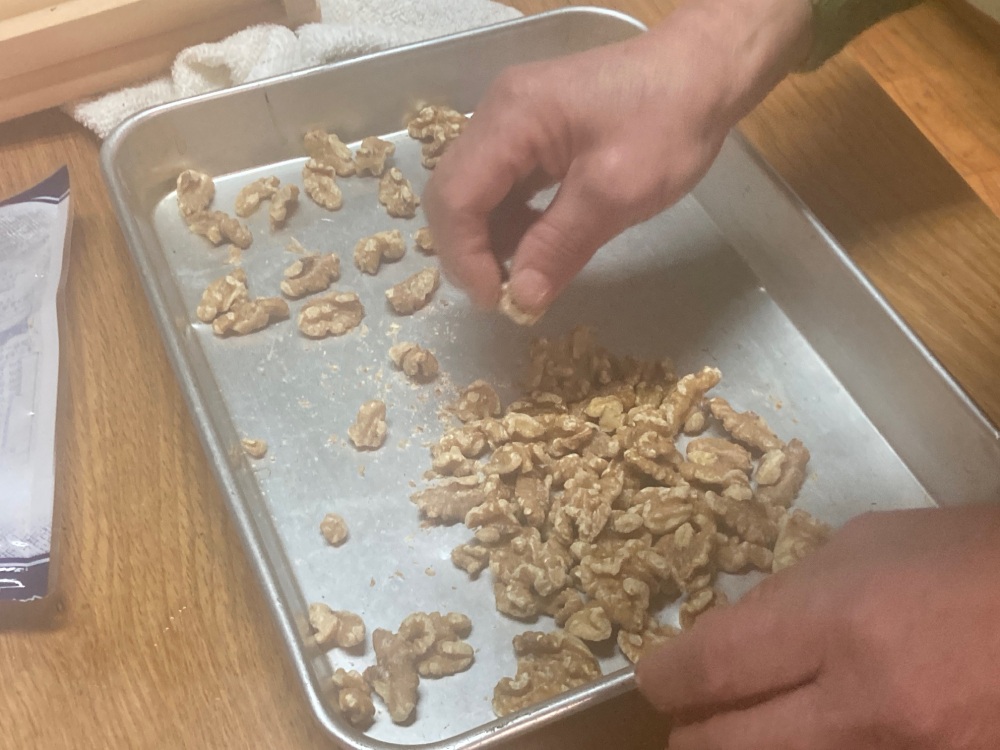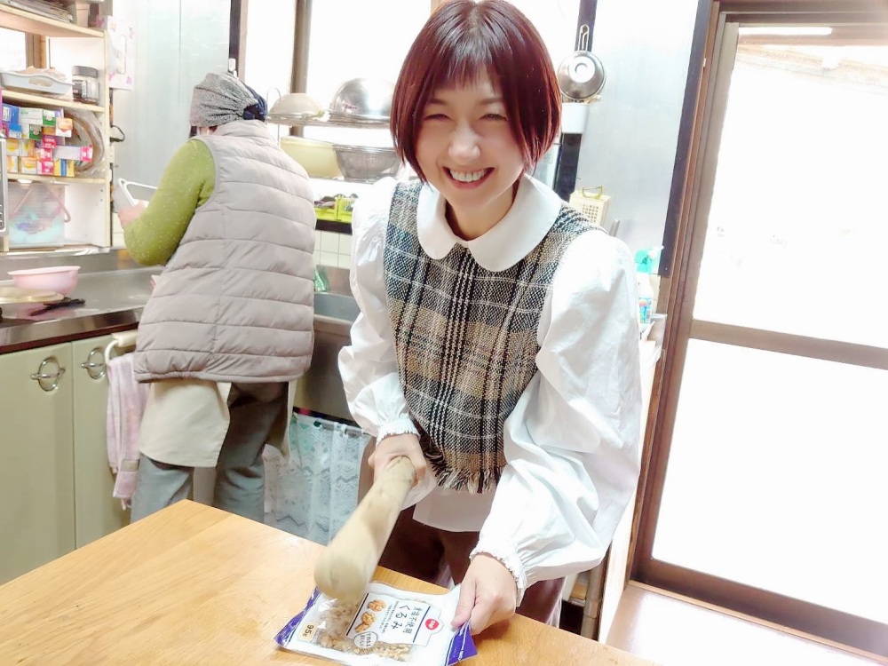 まずは、材料を分量通り測るところから始めましたが、そんな初歩的なことからうまくできない料理下手の私に亀井さん大笑い。「おいしきゃいいのよ〜」なんて励まされながら時間をかけて測った、砂糖、塩、水を、まずは鍋に入れて火にかけます。沸騰するまでの間は、具材である柚子の皮を剥き、さらに、からすみの上にトッピングする「くるみ」と、中に入れ込む「くるみ」に分け、中用の「くるみ」を砕きました。これが楽しい!