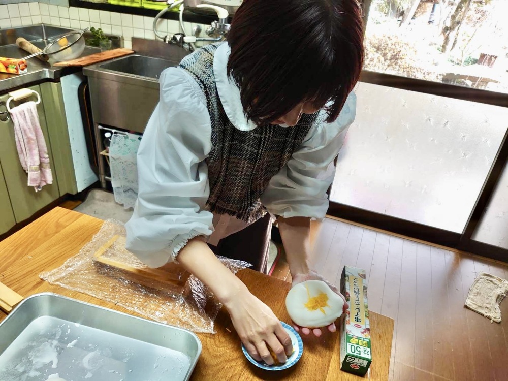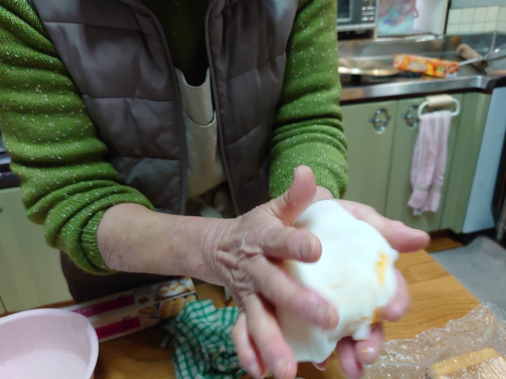次に、生地を取り出し6等分にしますが、この時、具材の好みの物を混ぜ合わせます。はじめは、生地が手にくっついて苦戦しましたが、手袋にお水をつけながらやると良いと教えてもらい、マメに水分を入れながらボール状に丸めた生地の中に具材を入れ込んでいきます。ゆずや、くるみのいい香りに包まれながら、柔らかいお餅を練っていくのが、子供の頃にやった粘土遊びみたいで楽しい〜!