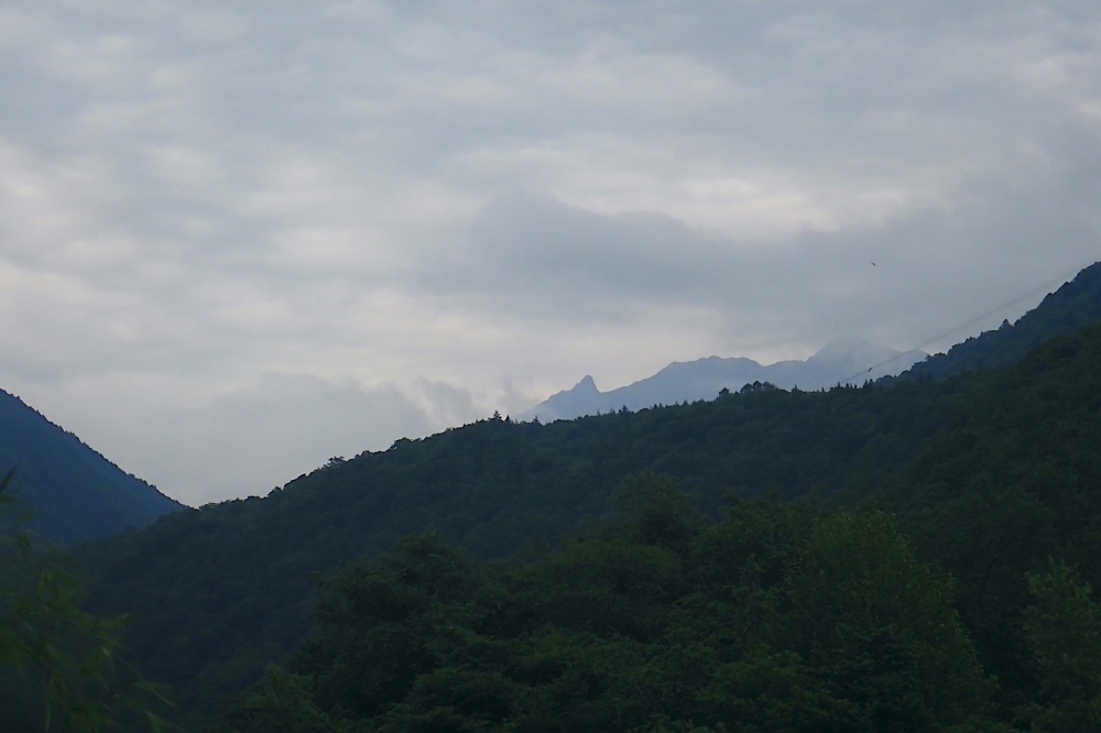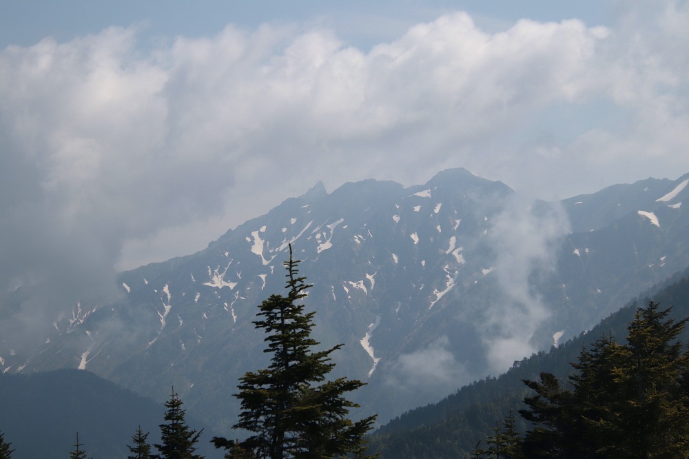 雲が多く、たまに小雨がちらつく生憎の天気だったのですが、ほんの一瞬だけ槍ヶ岳が顔を覗かせてくれました。山の神様に感謝です。