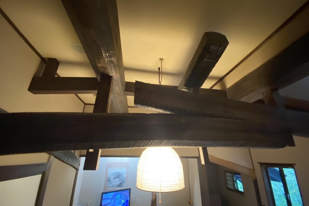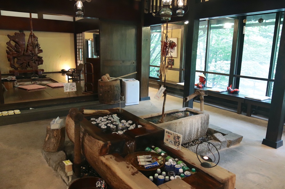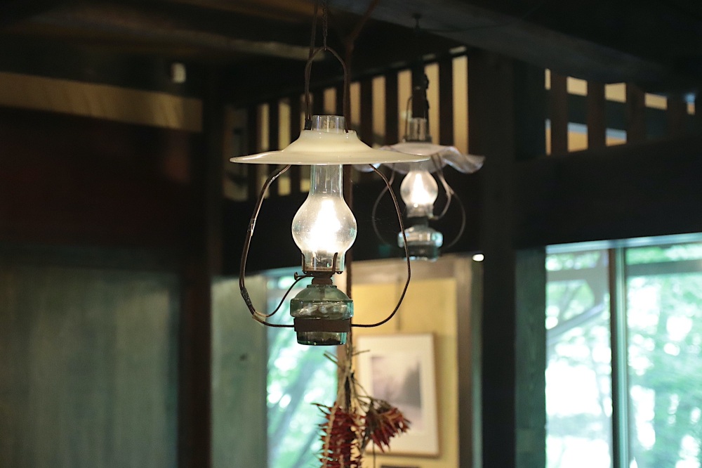 囲炉裏を設えた広間や、天井から吊るされたランプ、湧水で冷やされたドリンクなど、館内には、古き良き日本の香りがする空間が広がっていました。
