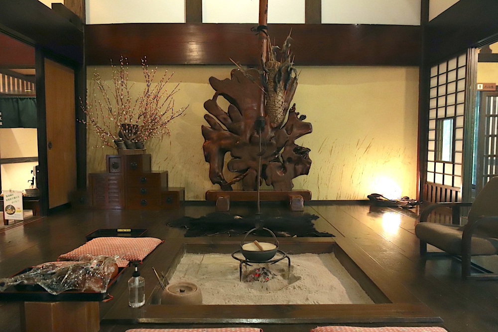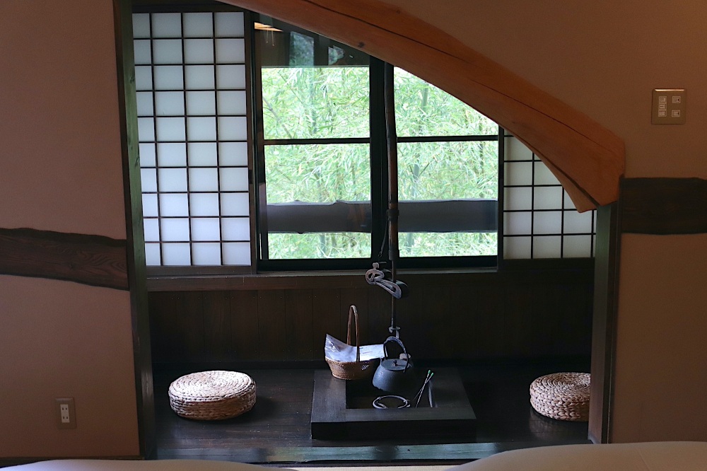 今回私が宿泊したのは民芸調タイプのお部屋。太い梁をいかした古民家造りの客室で、広縁には囲炉裏端が設けられていました。