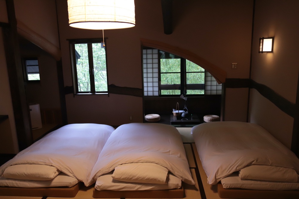 親子3人で寝るには十分な広さ。畳と木の香り、そして質感。都会のマンションに住んでいると、古民家のお部屋だけでも非日常を感じられますね。