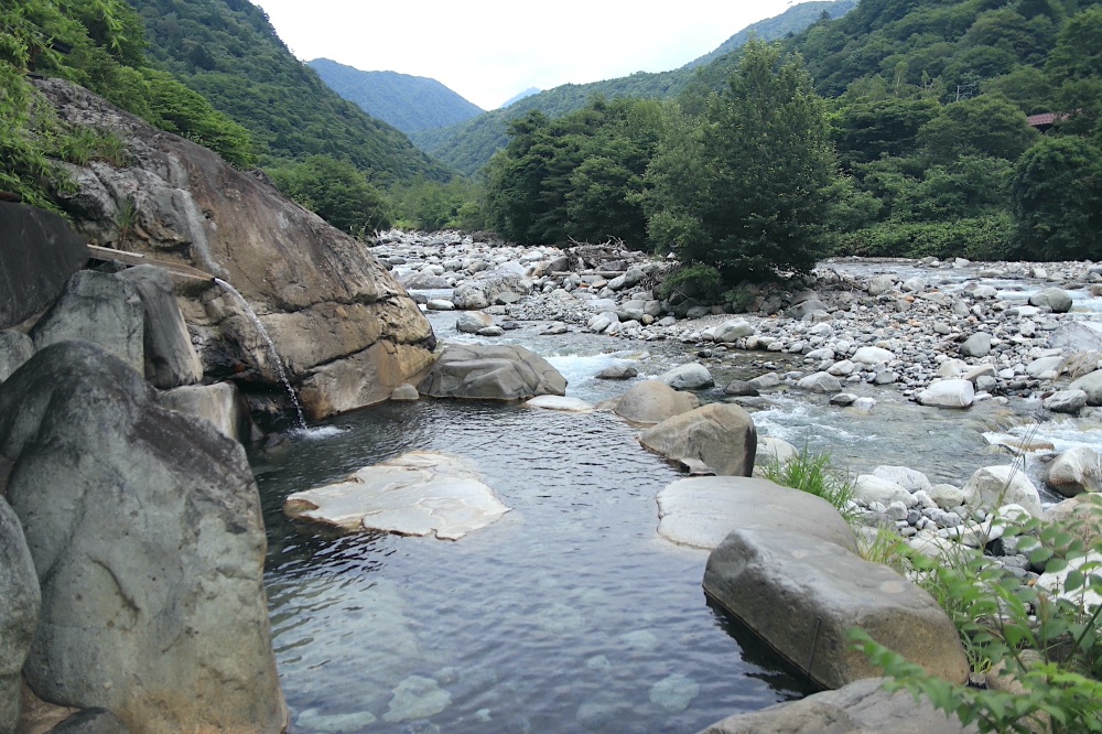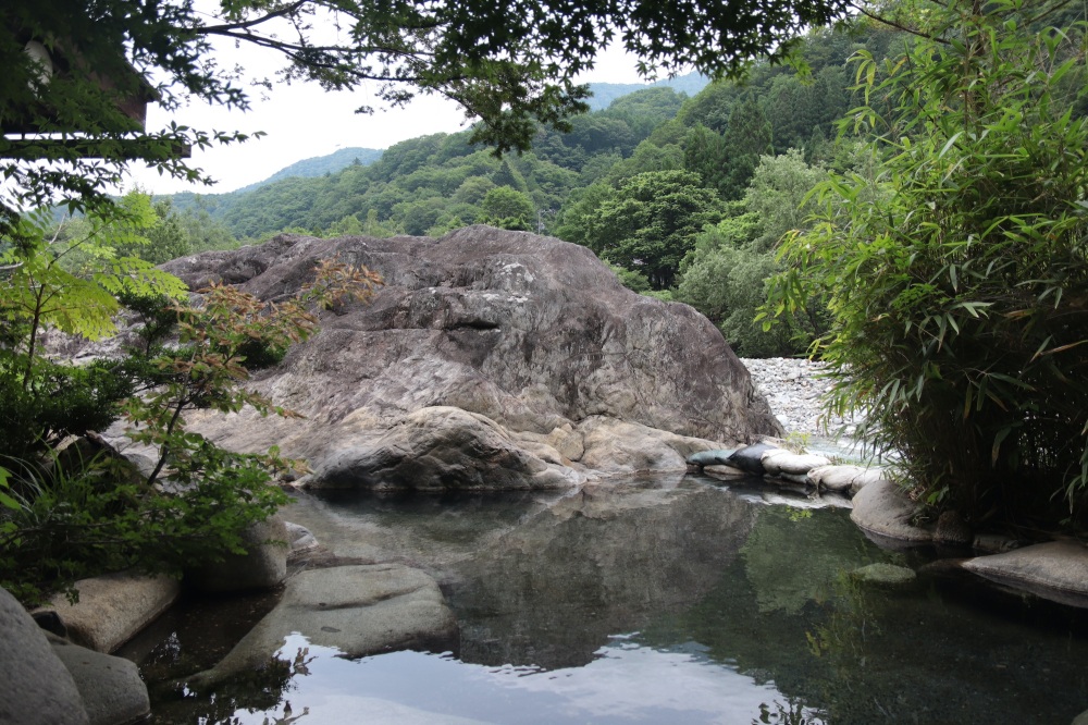 お宿を代表するのが、混浴露天風呂「槍見の湯」。蒲田川の川辺に設けられた岩造りの露天風呂で、天気が良ければ槍ヶ岳を望むことができます。