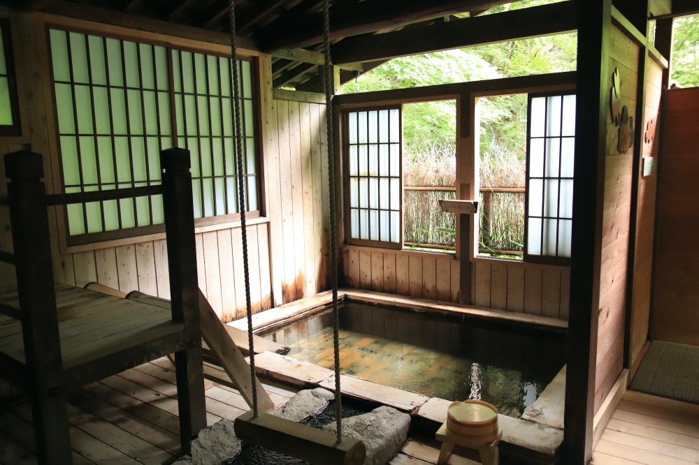 また「森の湯」は打たせ湯のほか、なんと滑り台やブランコ付き。家族連れでも温泉を楽しめる遊び心が感じられる湯小屋です。