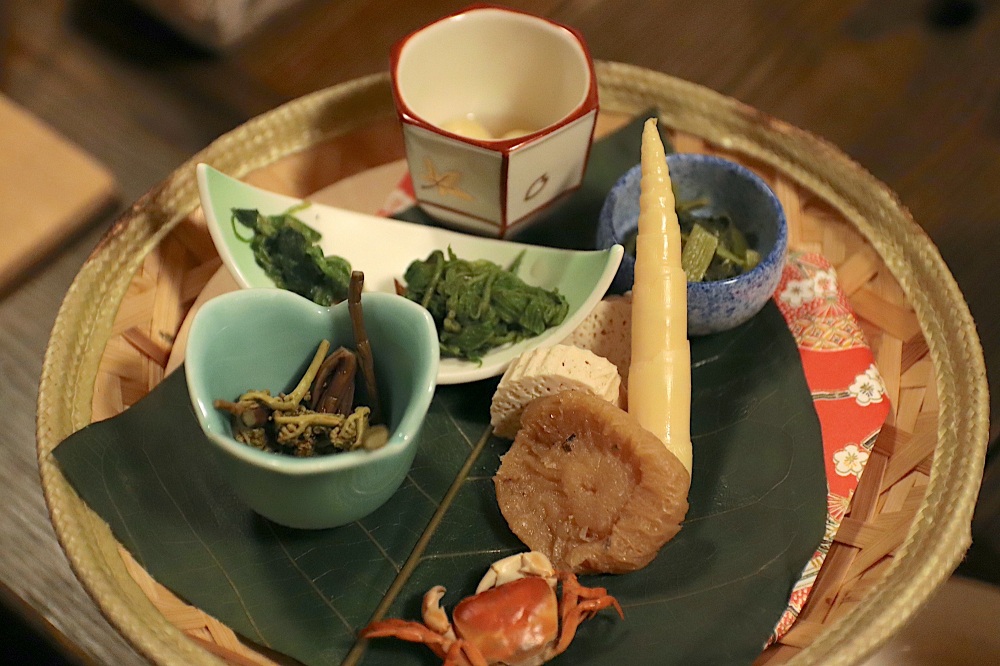 前菜は山菜のオンパレード。どれも地の味が生きた天然素材ばかりです。驚いたのは、その中にサワガニが出てきたこと。殻までそのままパクッとおやつ感覚でいただきました。