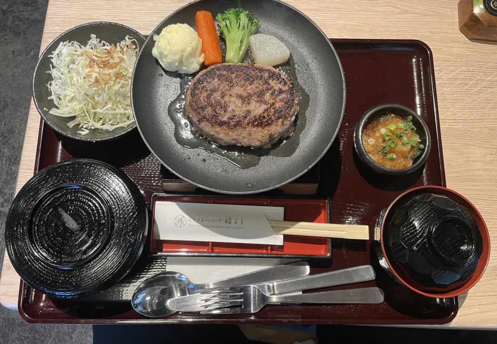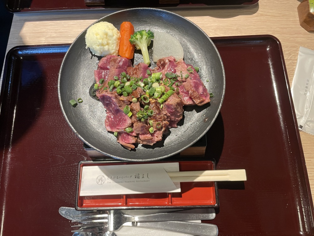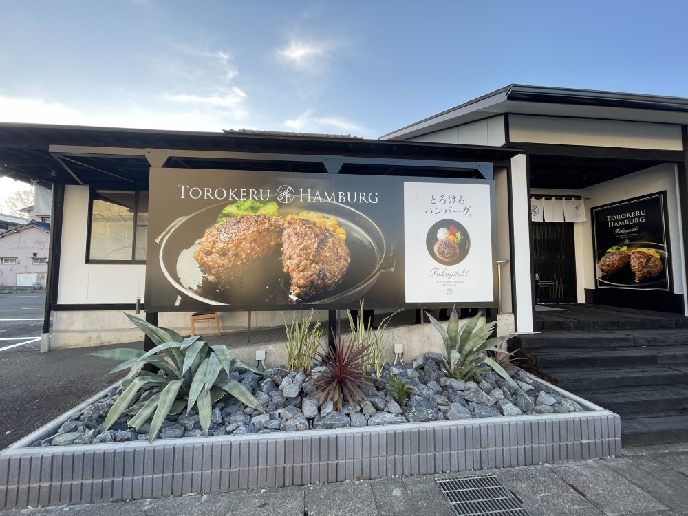 この景色が見える場所に、最近「とろけるハンバーグ福よし 岐阜長良店」がオープンしました。鉄板に乗せられたハンバーグは、ほとんどレアな状態で提供され、自分で好きな焼き加減にして食べられます。そして、とっても柔らかい。各テーブルにある調味料で、自分好みのガーリックライスを作るのもとっても楽しいですよ。