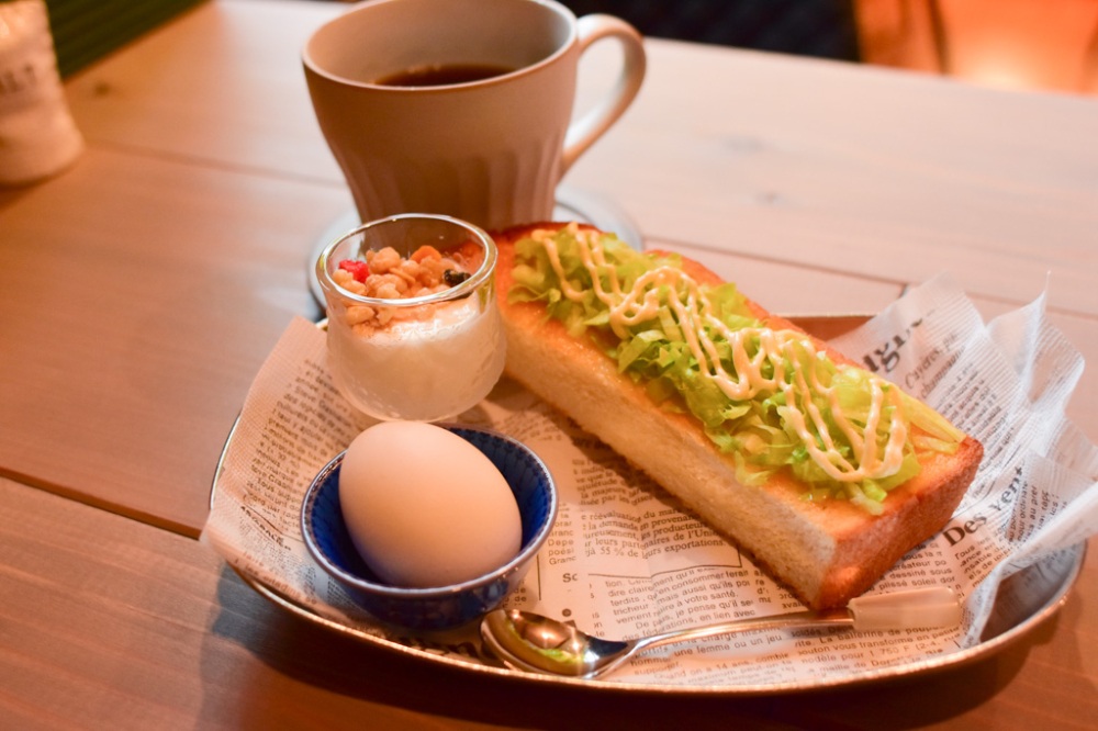 上記写真は「モーニングB」のトッピングの一つとして選べる「レタスマヨ」。一般的なジャムやバターに比べて、レタスマヨは珍しいトッピング。注文して、一緒に付いてくるゆで卵をレタスの上に乗せて食べてみたのですが、サンドイッチのようになっておいしく味わうことができました。
