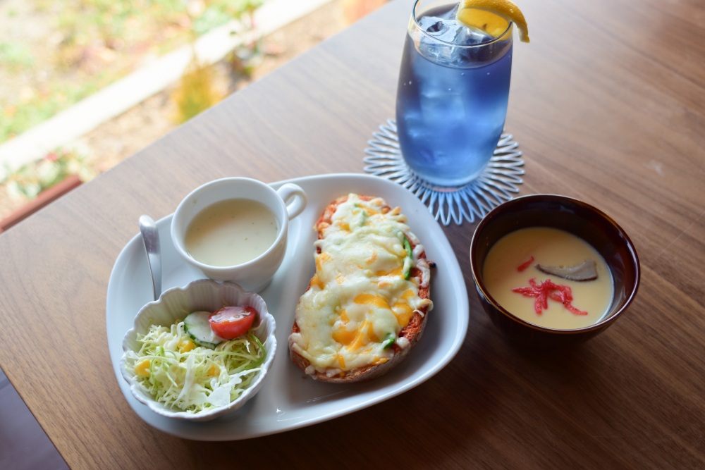 人気のモーニングはドリンク代のみでトースト、サラダ、スープ、茶碗蒸しの付く「Aセット」。トーストは、「バター」「こしあん」「いちご」「ブルーベリー」「ピザトースト」から選ぶことができます。その中でもおすすめはピザトースト。風味のいい酵母パンにチェダーチーズが乗って味わい豊かな一品に仕上がっています。