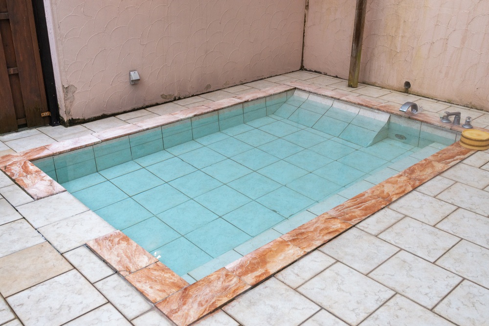 「ホテルくさかべアルメリア」は楽しい雰囲気のホテルです。プールのように広い露天風呂が付いたタイプの部屋に息子と宿泊し、とても楽しい親子の思い出になりました。見た目はプールですが、そこを満たしているのはポカポカの温泉です。息子は、大きな露天風呂に大興奮でした!