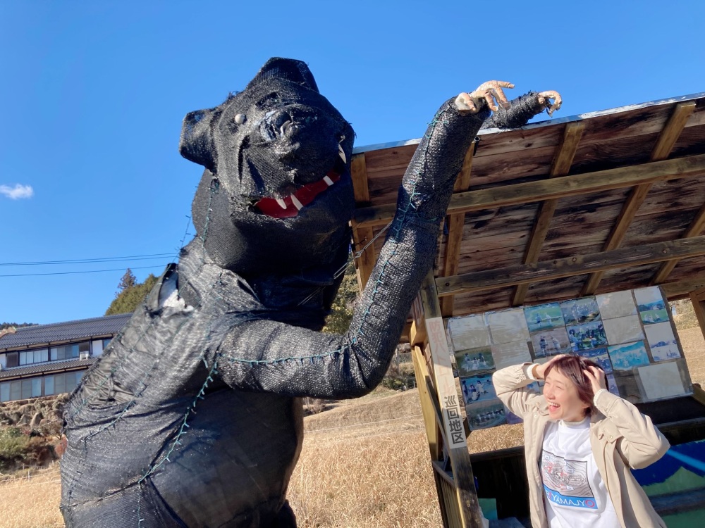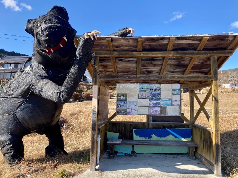「切山」のバス停には、3mくらいある「クマ」のかかしがバス停を襲っていたり、洗濯物を干しているかかし、乾杯をしているかかし等、たくさんの「リアルかかし」に出会えるのも楽しいですよ〜!