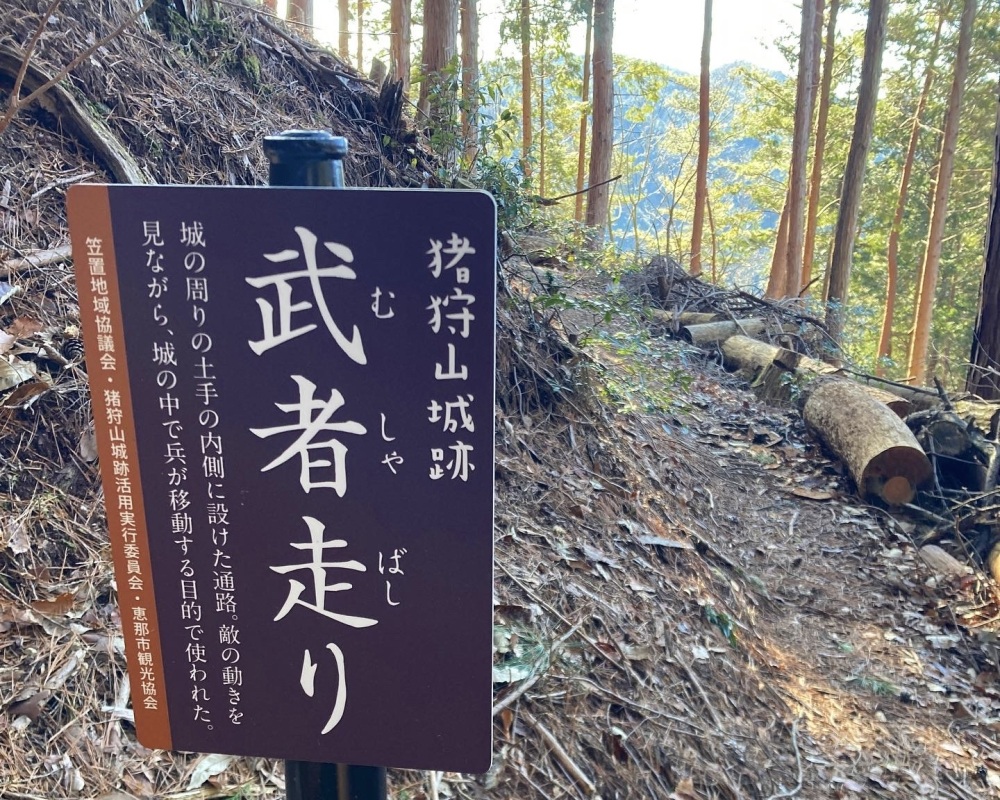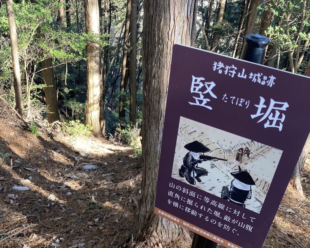 地形の険しさを巧みにいかしたこの山城には、主郭(しゅかく)を取り巻く2〜3段の腰曲輪群(こしくるわぐん)と、堀切(ほりきり)、竪堀(たてぼり)、虎口(こぐち)、切岸(きりぎし)と、一通りの構えが残っています。特に、城の中心となる曲輪の周囲に、敵が登れないよう斜面を削って作った断崖「切岸」が迫力あって見応えがありました。道も整備され登りやすく、標柱もあって分かりやすいので、お城に詳しくなくても楽しめますし、登城口から見る農村の広大な景色に心が癒されますよ〜。ちなみに、笠置コミュニティーセンターで、猪狩山城の御城印やグッズを販売していますので、欲しい方はお立ち寄りください。