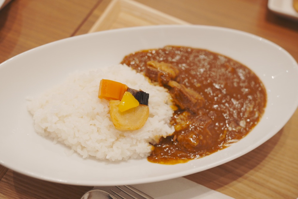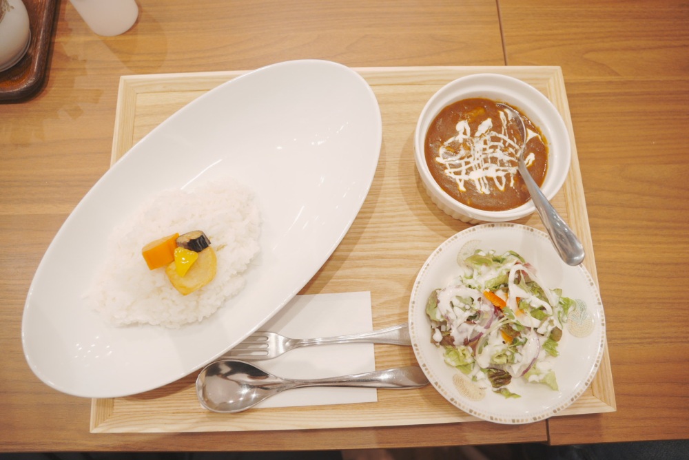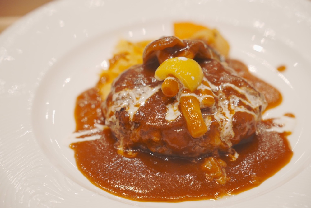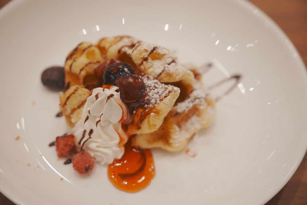 スパイスが効いたカレーは、香りだけでおいしいと分かる本格的カレー。ハンバーグはフワッとしていて、ソースも抜群でした。デザートのワッフルには、甘いけれどちょっと酸味のあるベリー系のソースがかかっていて、焼き加減もサックリしていておいしかったです。