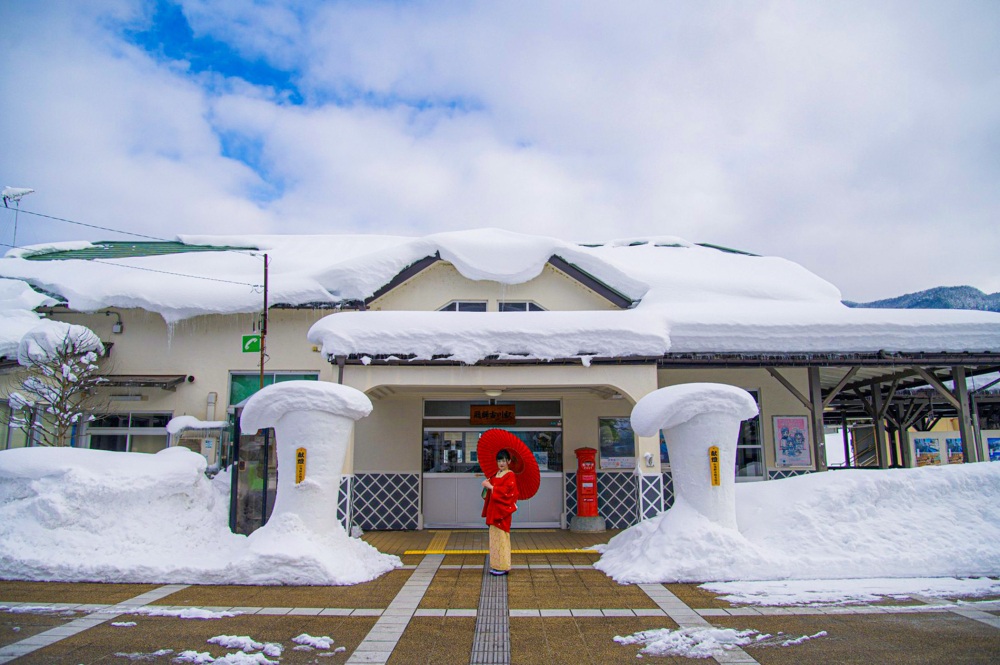 当日、案内所で「駅に隣接する跨線橋に撮影スポットとわかるように印がある」と教えていただきスタンバイ。赤い和傘をさし、素敵な風景の中に入り込みました。