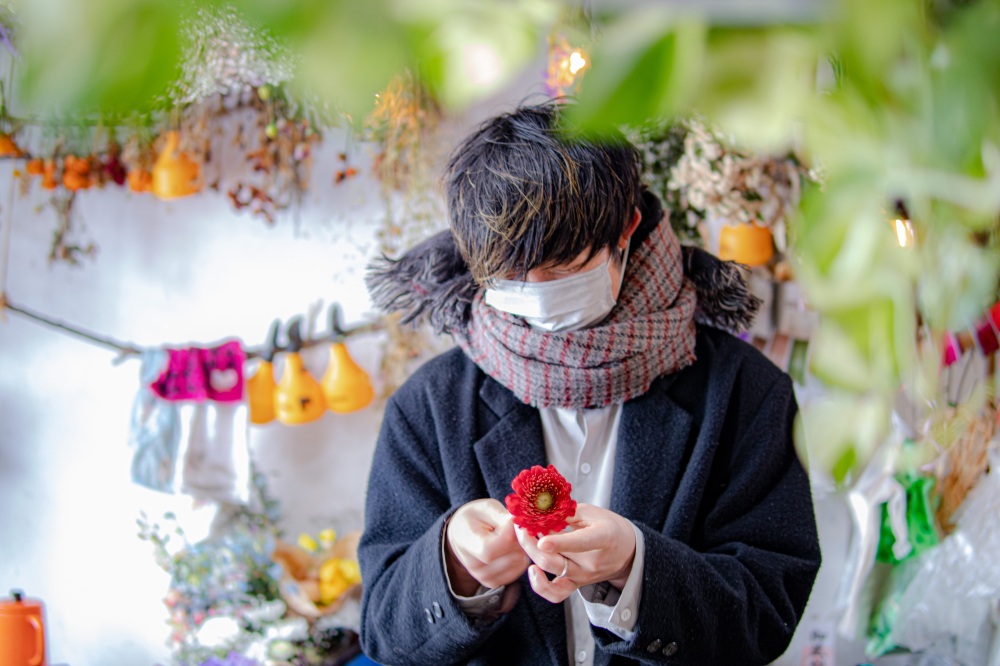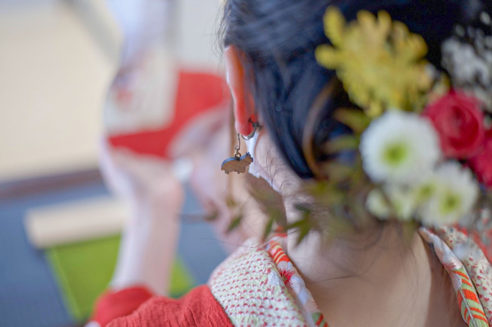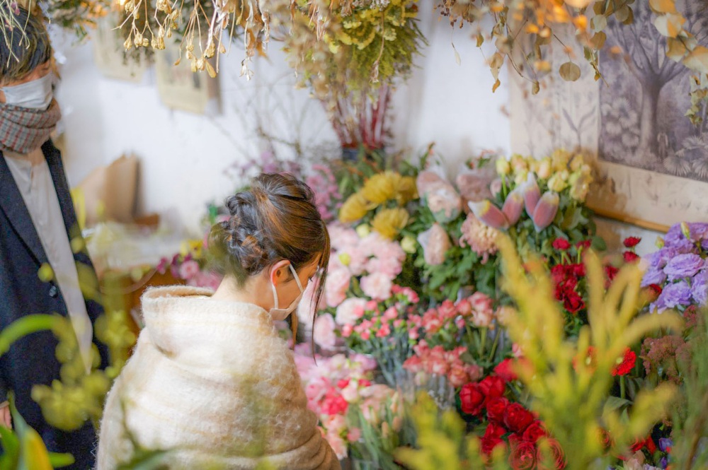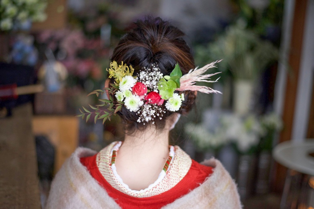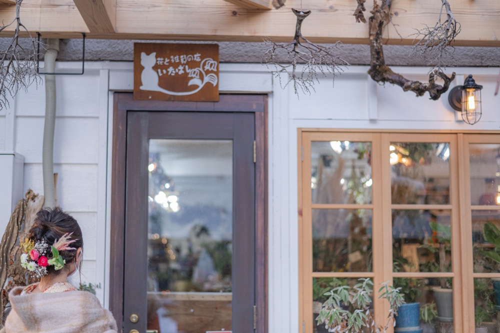 「着物に合わせて生花を髪に飾りたい」と思い、「花と雑貨の店 いたばし」にお邪魔して、髪飾りを作っていただきました(予算と色味を伝えるとスムーズです)。お店は三寺のひとつである「円光寺」や「千本ろうそく」設置場所のすぐ目の前。