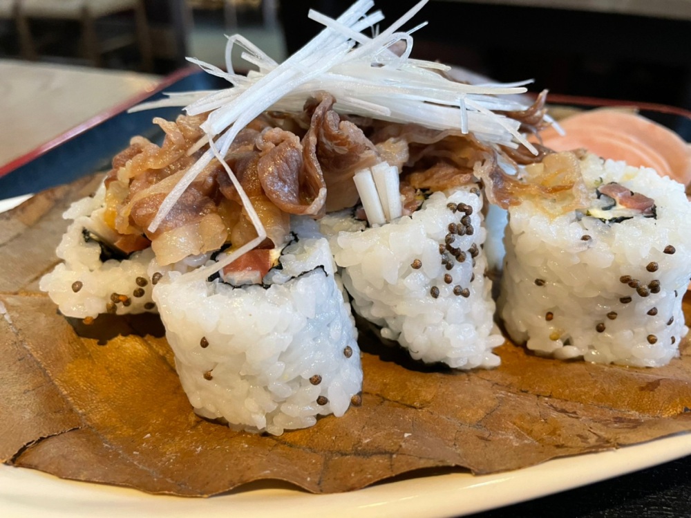 初めて食べた「Hida Roll」(ヒダロール)は、赤カブ、えごま等のポップな食感に、飛騨米の酢飯、飛騨牛の旨みがふわりと寄り添う新感覚の巻き寿司でした!