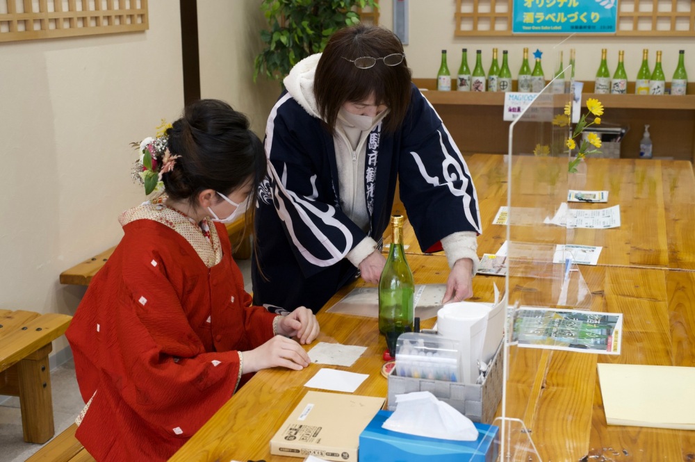 体験は、蒲酒造場と渡辺酒造店、どちらか好きな酒蔵の純米吟醸酒を選んで、マイラベルを貼り付け持ち帰るというもの。お酒好きにはたまりません。