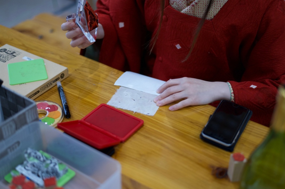 作業スペースには、カラーペンや祭屋台のシンボルスタンプ等、豊富な材料が揃っています。