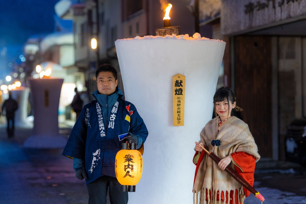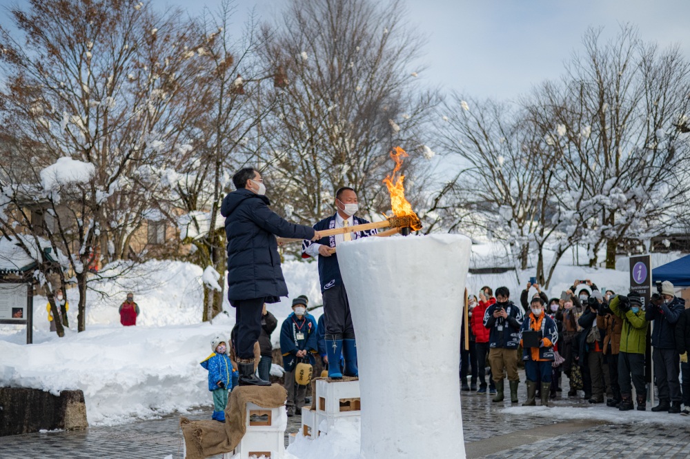 午後4時、まつり広場にて点灯式が始まり、市長らの掲げる松明から2mの雪像ろうそくに火が灯されると、辺りは一気に幻想的な雰囲気に。