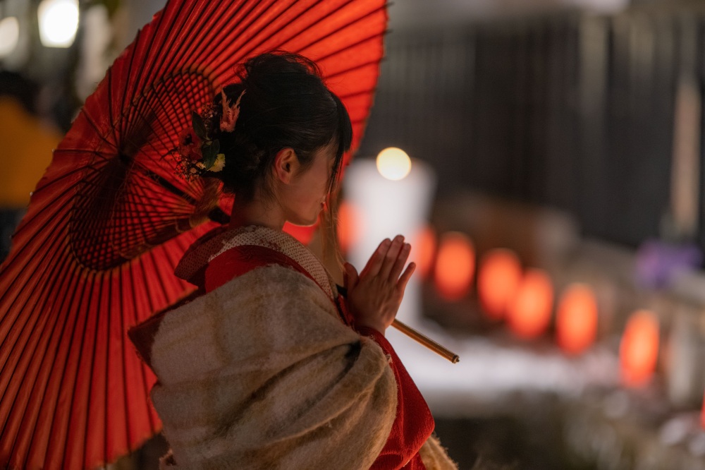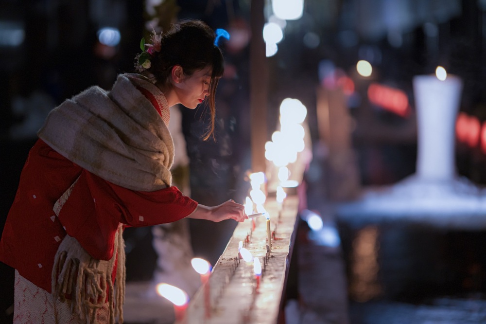 着飾った女性たちの祈りの傍で優しく手元を照らすのは、今も昔も全て手作り、三嶋和ろうそく店の紅白の和ろうそく。