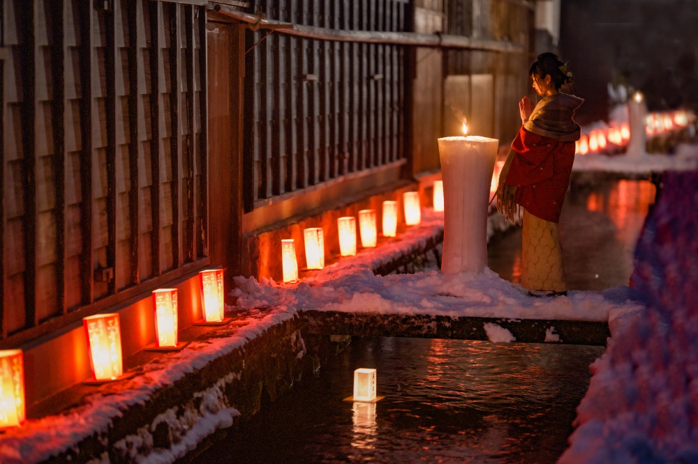 昼間の景色とは打って変わり、揺らめくろうそくや灯篭の灯りが雪や白壁土蔵を染める瀬戸川沿い。