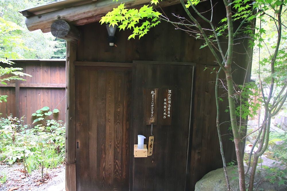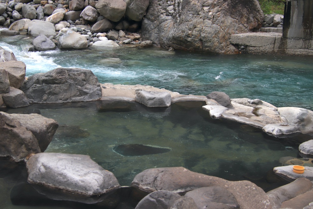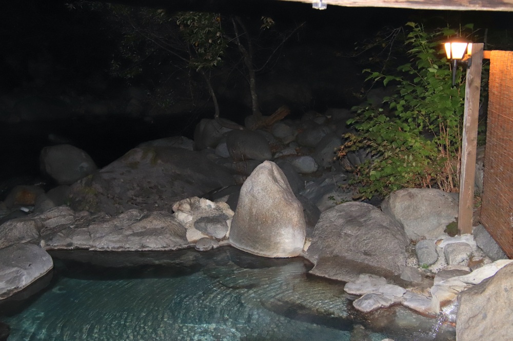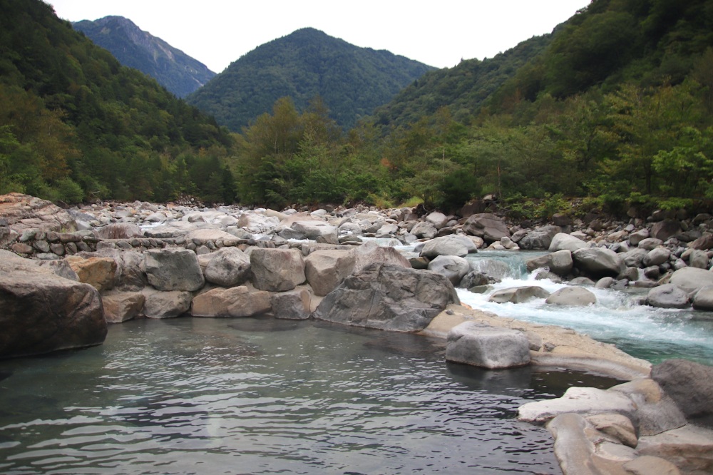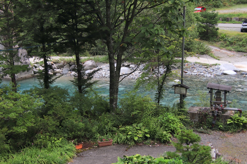 浴槽は二つあり、温度が高めのお湯と、少しぬるいお湯の二つが用意されています。隣にはエメラルドブルーの高原川が流れており、隔絶した秘境感がたまりません。