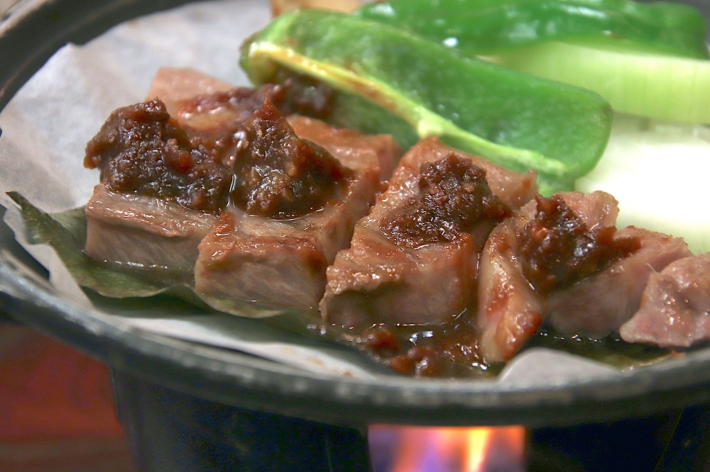 味付けは、飛騨の郷土料理・朴葉味噌。口に入れると肉汁が溢れ出す上質なお肉と、香り豊かな味噌の相性がたまらない一品です。