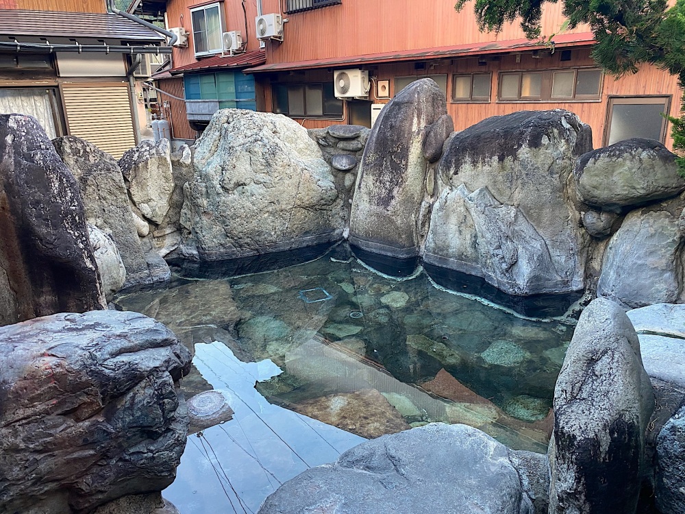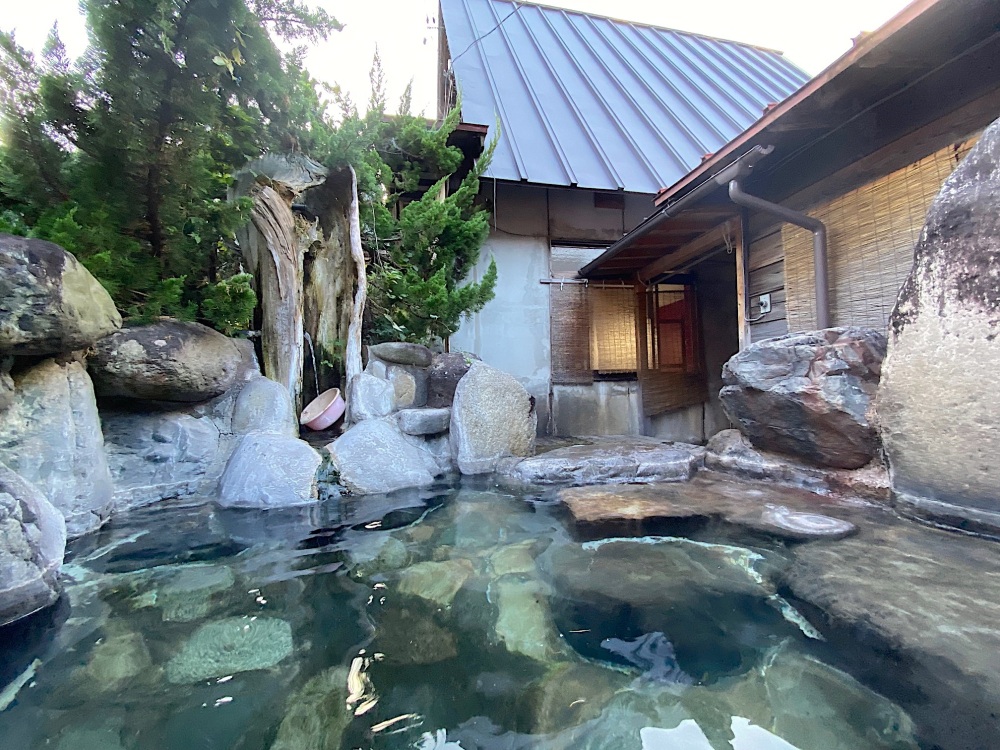 その一方で露天風呂は、巨石で囲って作り上げた野趣ある浴槽。正直、道を歩いている人が岩に登って、お風呂を覗き込めば見えなくもない開放感なのですが、このワイルドさもまた味わい深いです(笑)