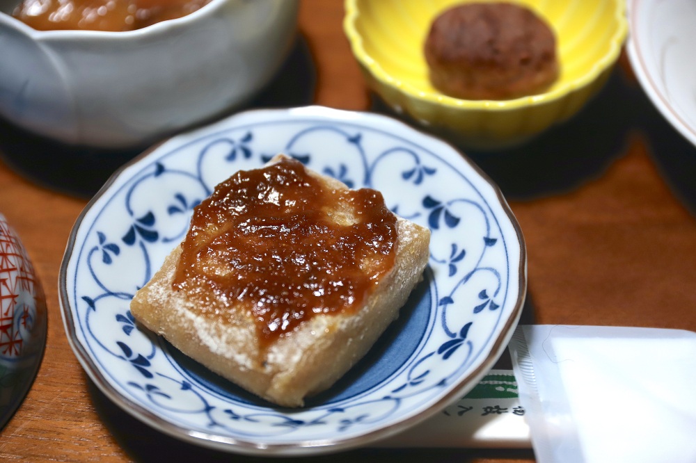 中でも抜群においしかったのは、自家製の「栃餅(とちもち)」。自家栽培のもち米と、大白川の山中で採れた栃の実を混ぜて作った郷土料理です。