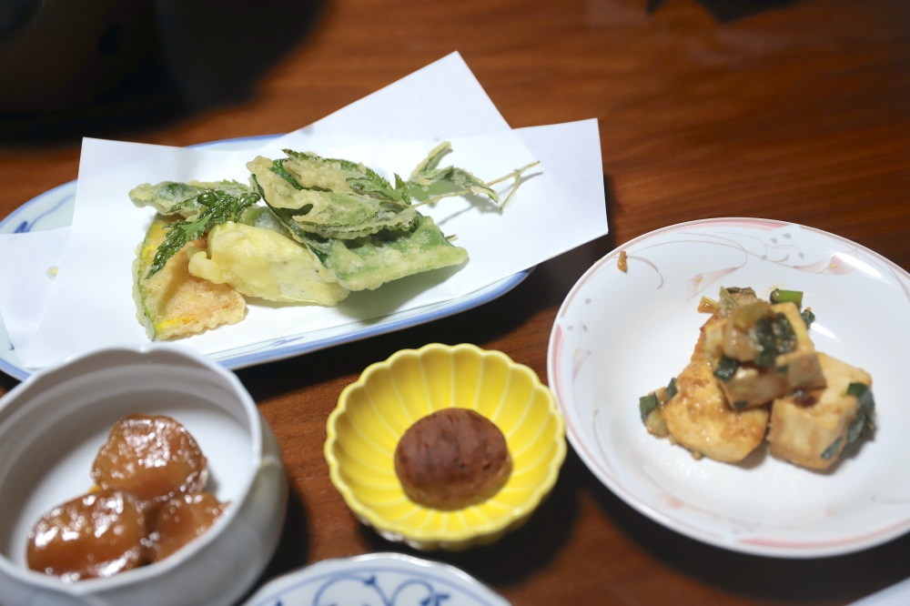 野菜や山菜の天ぷらもホッと安らぐおいしさ。焼き魚を出していただいたり、小鉢類も充実していて、食べきれないぐらいのボリュームでした!