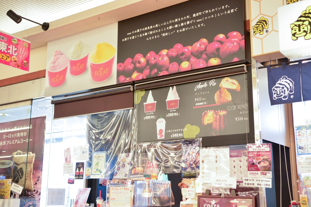 養老町に本店を構えるお菓子屋さん「ECLAT enne」のお店もあります。厳選した素材を使ったジェラートがおすすめで、その中でも特に養老町の特産ブランドに認定された「養老サイダーソルベ」は絶品。暑い日はサイダーのさわやかさと甘みが体に染みわたります。