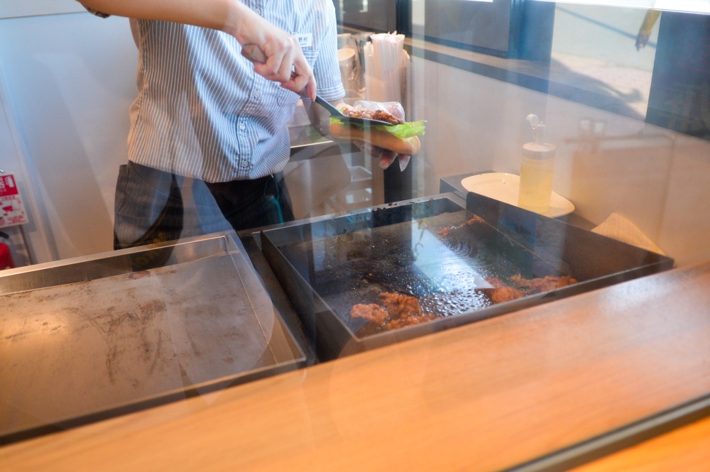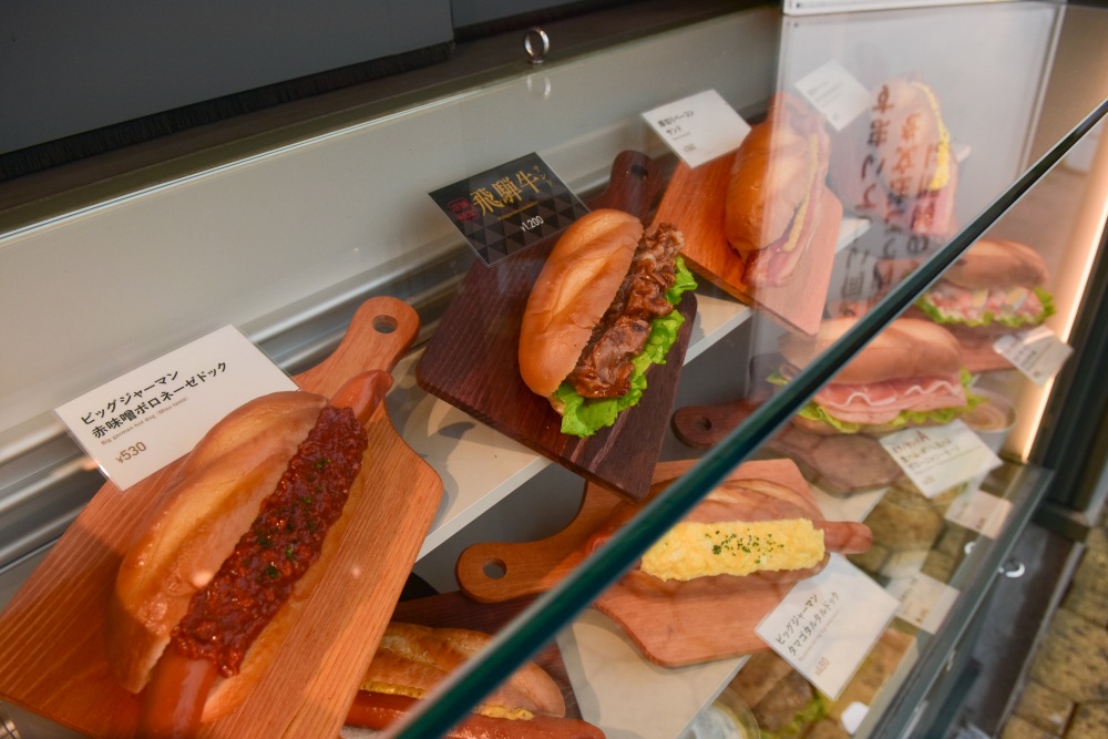 ライブキッチンがあるのも特徴で、例えば「飛騨牛サンド」を注文すると、目の前で肉を鉄板で焼き、パンにサンドしてもらえます。