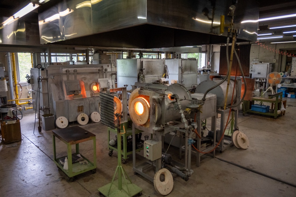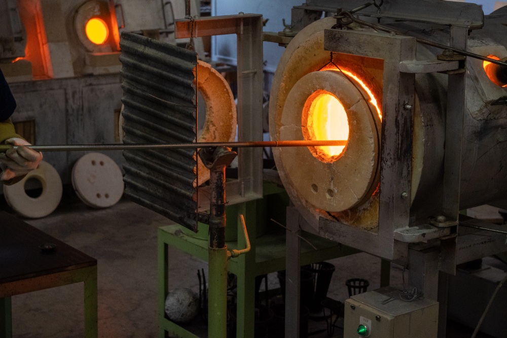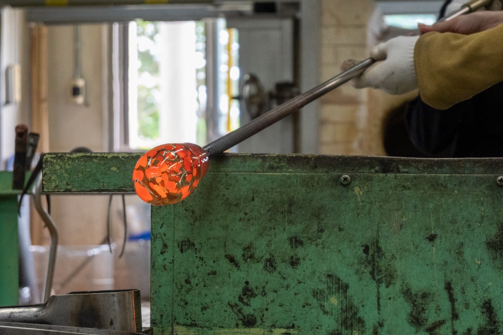 次に作業場へ入り、先生の指示通りに動いていきます。吹きガラスを全て自分で進めるわけではないので安心してください。高温の炉で溶かされたガラスを、先生が形を整えながら息子のところへ運んできてくれます。「息を強く吹いてみて」という合図。