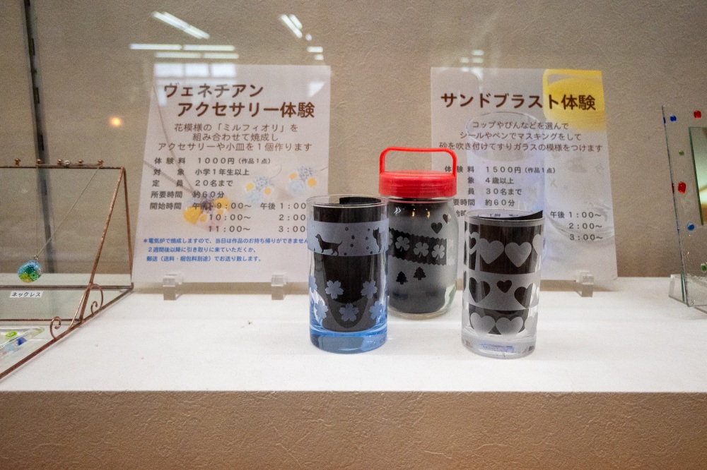 さて、こちらでは色々なコースが選択可能です。長男は「吹きガラス体験」、二男は「ヴェネチアンアクセサリー体験」、三男は「サンドブラスト体験」を選択。