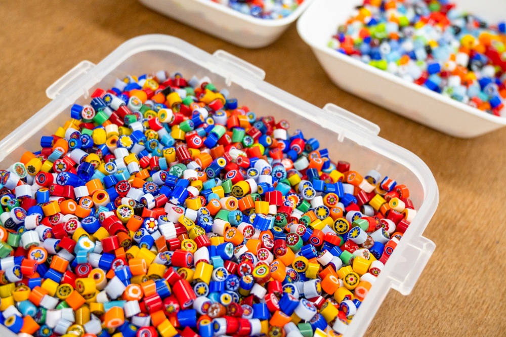 ヴェネチアンアクセサリー体験は、自分の好きなビーズを選んで専用の台紙に配置するだけ。制作活動が苦手な方にもおすすめです。台紙にビーズの配置ができれば、あとはスタッフさんがガラスで仕上げてくれます。