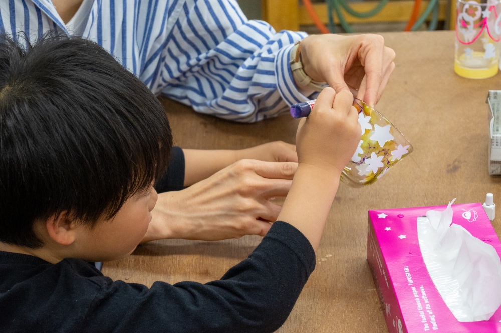 サンドブラスト体験は、コップや瓶にジェルで絵を描いたりシールを貼ります。そのあと専用の機械で砂を吹き付けて全体を「すりガラス」に。最後にジェルやシールを剝がすと、その部分だけ透明に仕上がるのです。4歳の息子でも簡単に、楽しく製作できました。