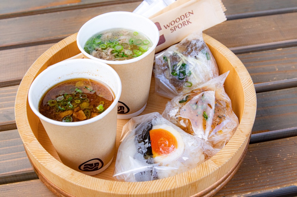 豚汁セットや肉吸いセット(いずれもお好きなおにぎり2つ付)等の汁物も、専用の手提げが付いて持ち歩きに便利です。