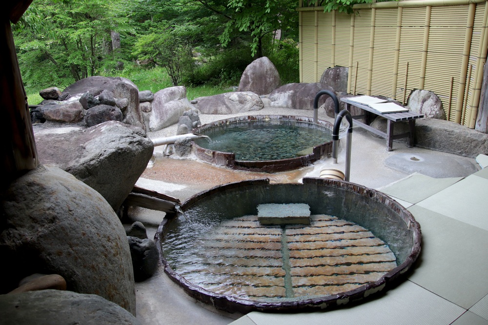 お風呂は全部で4つ。貸切露天風呂2つと男女別の内湯で構成されています。焼岳地獄温泉から源泉を引いた、大地の力を感じるお湯です。