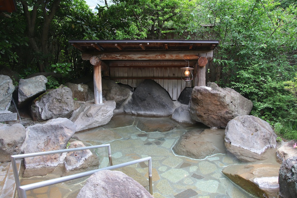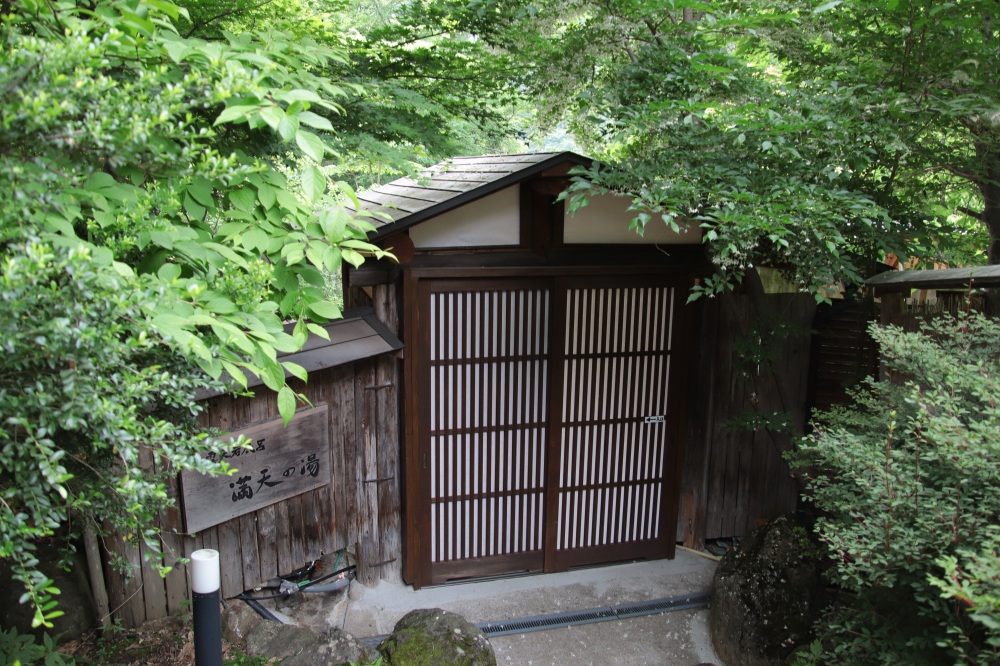 「満天の湯」は、貸切無料とは思えない広々とした岩造りの露天風呂です。離れになっていて立派な門をくぐった先に設けられています。こんこんとお湯が湧くお風呂の中で、北アルプス山麓の自然と向き合う静かな時間が待っています。