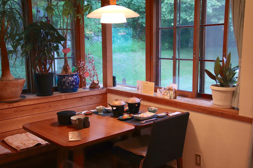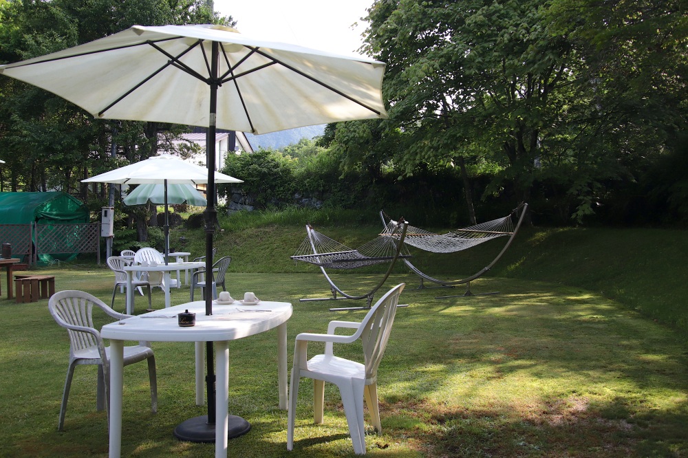 朝食も「ペンションほのみ亭」さんに宿泊する魅力の一つ。なんとペンションのお庭が5月からオープンテラスに変わり、奥飛騨の自然に囲まれた空間で朝食を味わうことができます。ハンモックもあり、爽やかな朝の風を感じて寝転ぶのも気持ち良いです。
