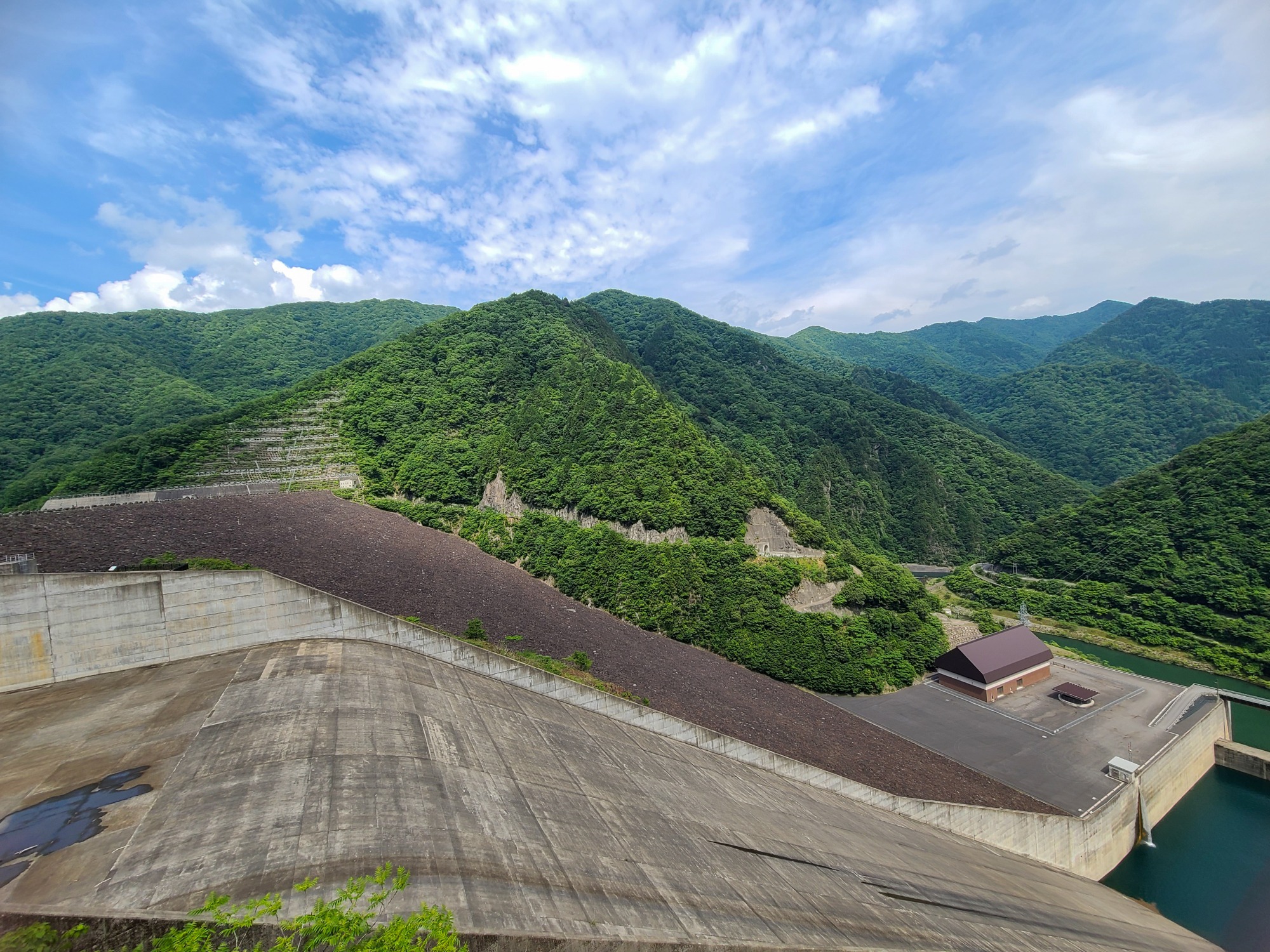 展望台からはダム全体と美しい深緑の山並みを見渡すことができます。(2023年6月撮影)