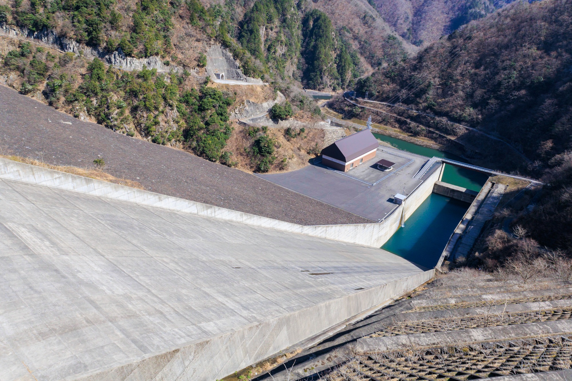 堤高は161メートル。まるで吸い込まれそうな急斜面は、洪水吐き(こうずいばき)ゲートで、ダムに貯めた水を下流に放流するための設備です。