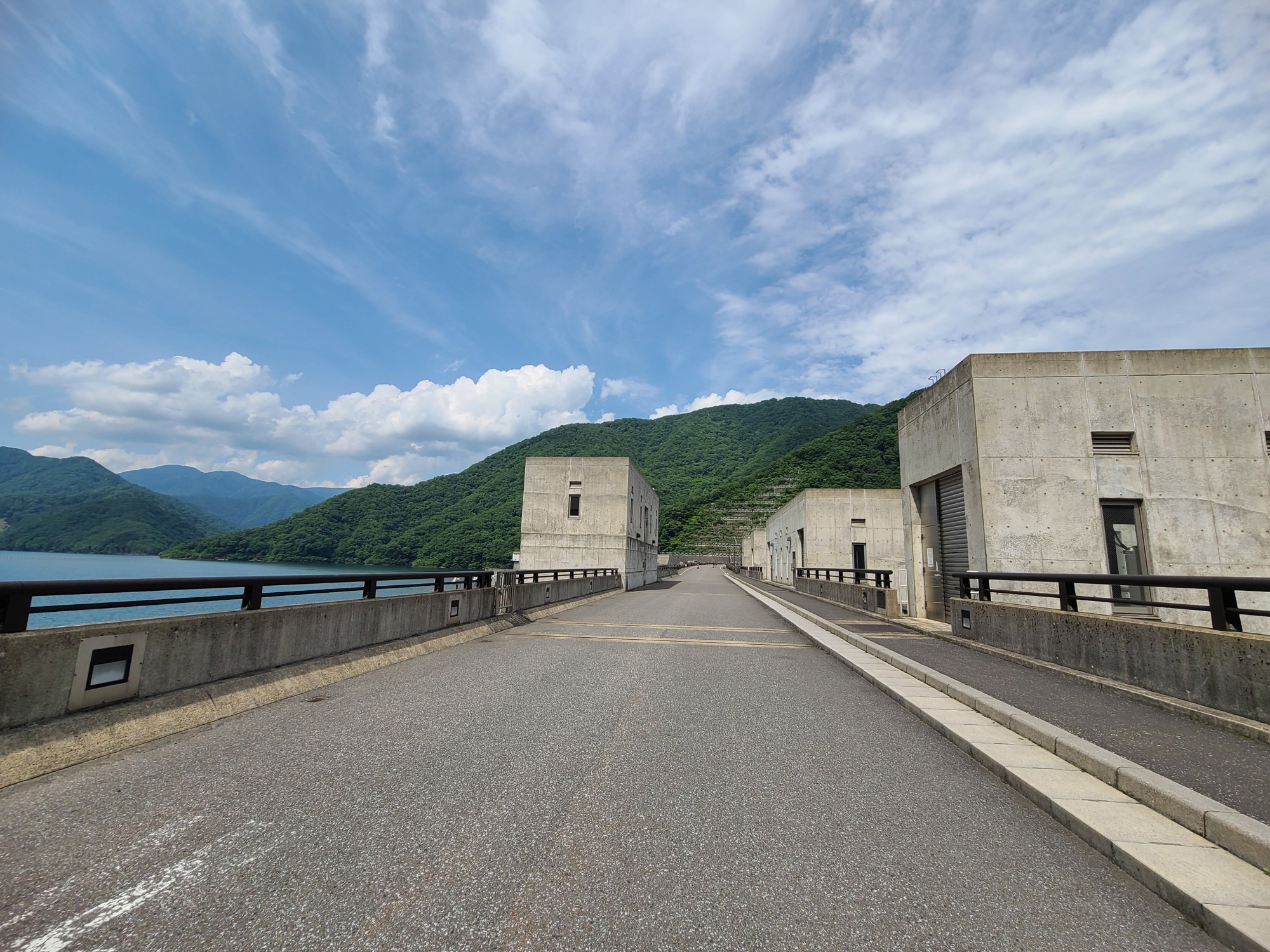 ダム管理所の前を進んで行くと、ダムの対岸へつながる堤頂道路があります。往復で約1kmある堤体の上を歩いて、ダムの大きさを体感してみてはいかがでしょうか。